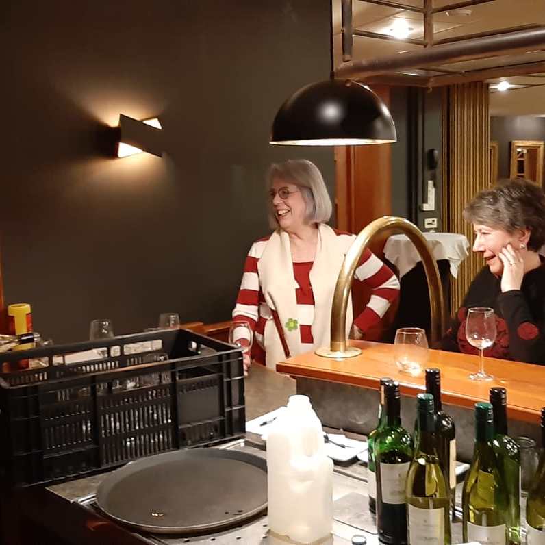 Om 18.00 uur was iedereen weer op tijd voor het diner. Inge Kooijman (eigenaar BridgeTravelling) en haar man zijn ook vanmiddag aangekomen en eten gezellig mee. De ronde tafels weer prachtig gedekt en dit keer kregen de gasten zalm of een schnitzel geserveerd, nadat het voorgerecht van rauwe ham met zongedroogde tomaatjes achter onze kiezen was verdwenen. Ook de suikerwafel met ijs en slagroom smaakte heerlijk.