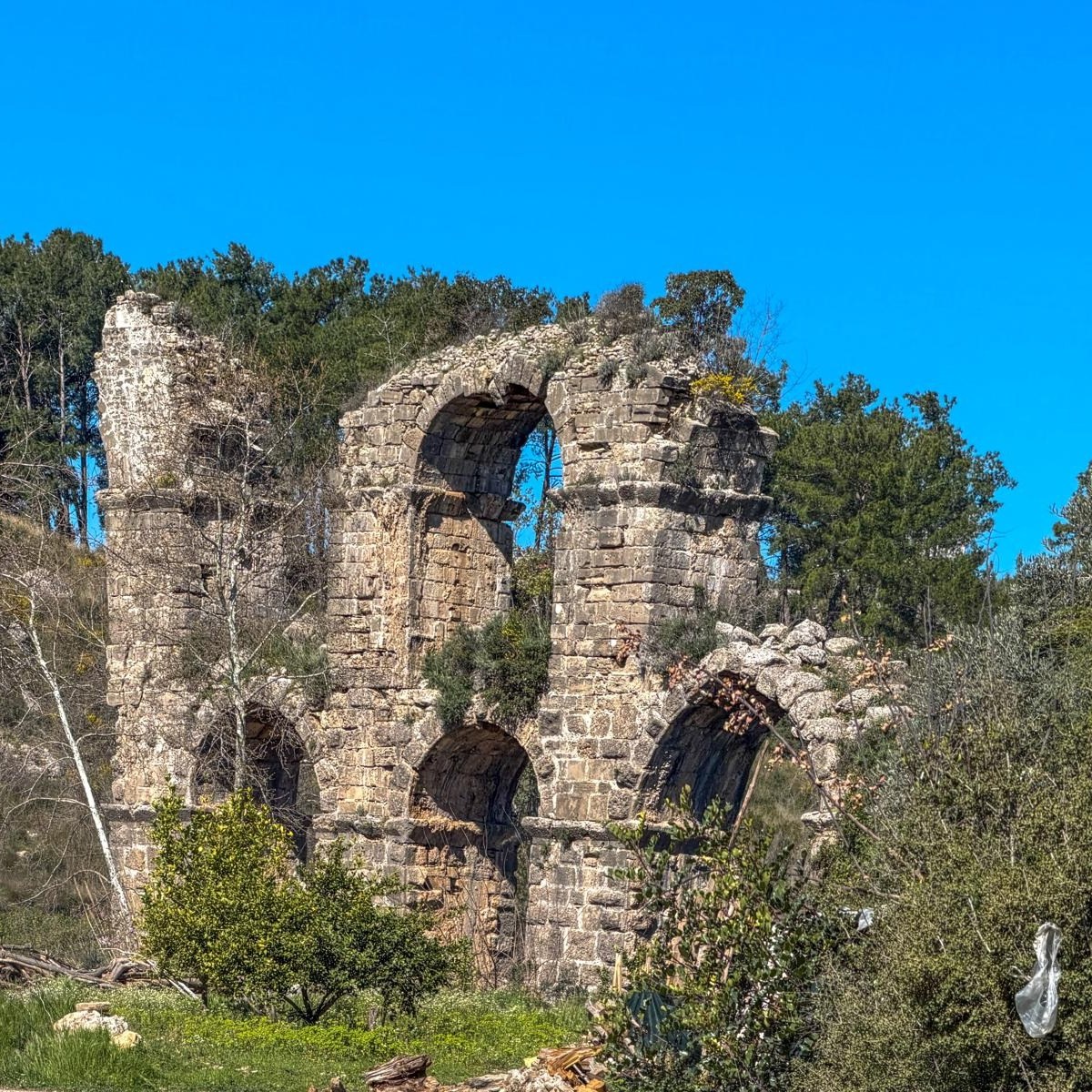 We zien de resten van de aquaducten van Aspendos. Deze waterleidingen werden al in de Romeinse tijd gebouwd om de stad van vers water te voorzien. Het is bijzonder om te bedenken dat dit ingenieuze systeem bijna tweeduizend jaar geleden al functioneerde.