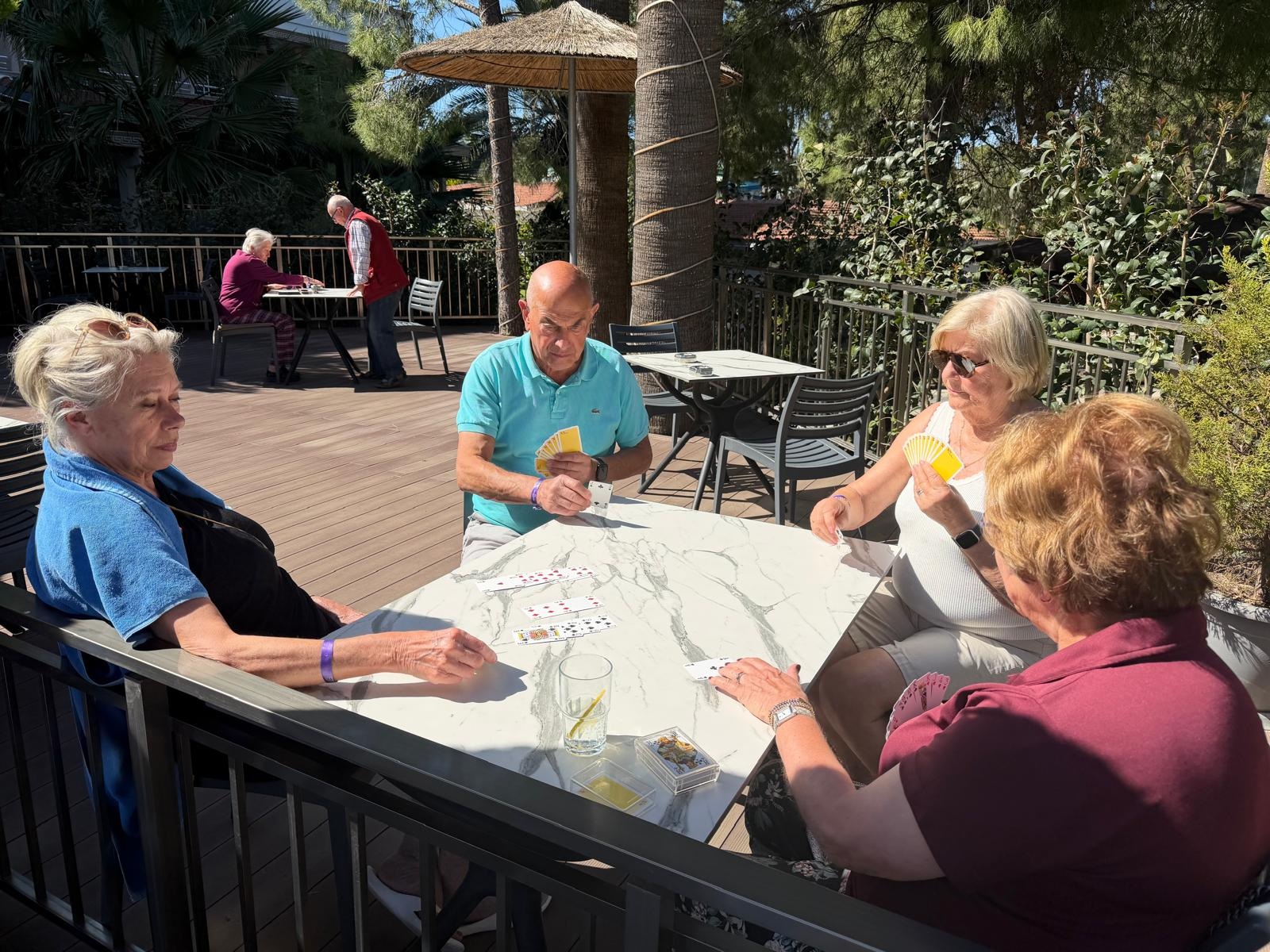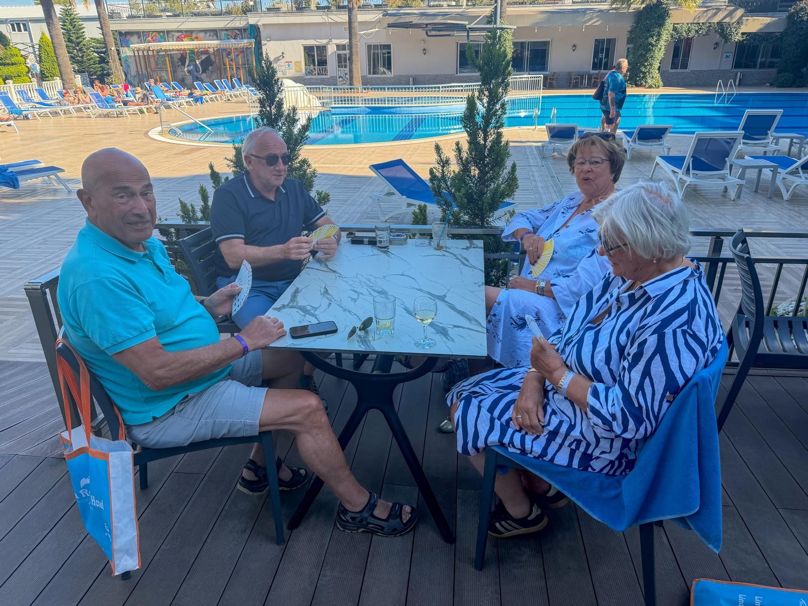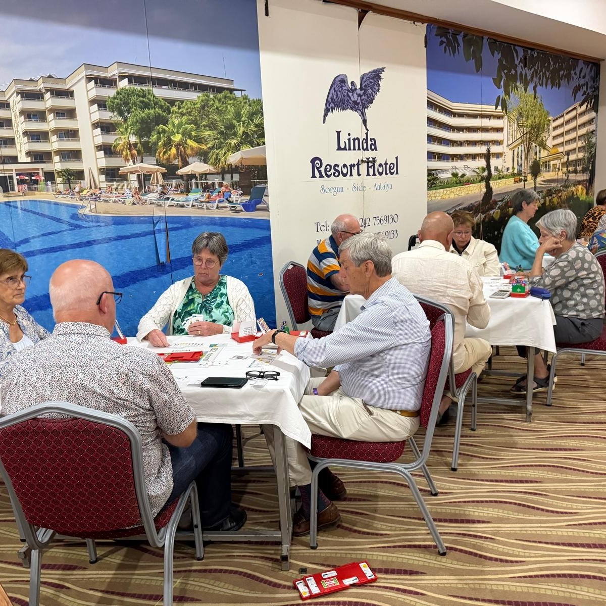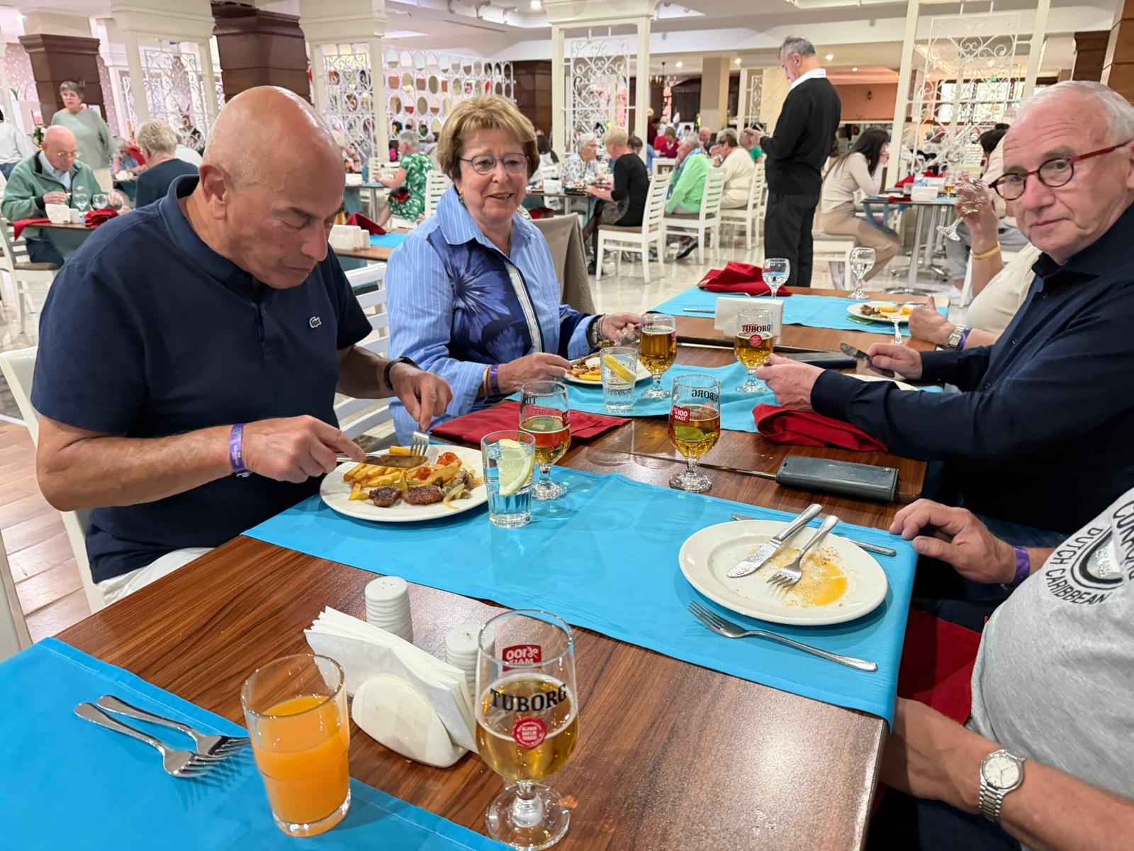 Na het welkomstcadeautje zijn we om 17.15 we begonnen met bridgen. Na twee ronden gespeeld te hebben, hebben we genoten van het diner. Daarna werden nog vier ronden gespeeld. Zo konden we het bridgen ruim voor 23.00 uur afronden, zodat iedereen nog even gebruik kon maken van de all-inclusive faciliteiten. 🍹♣️