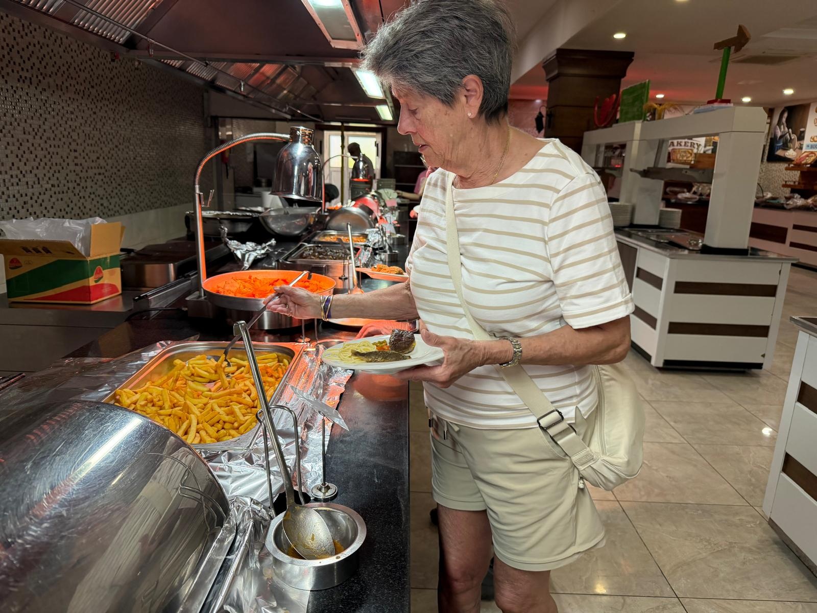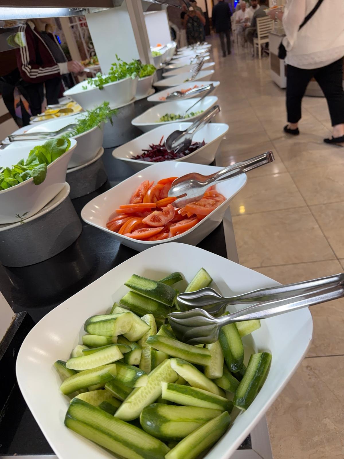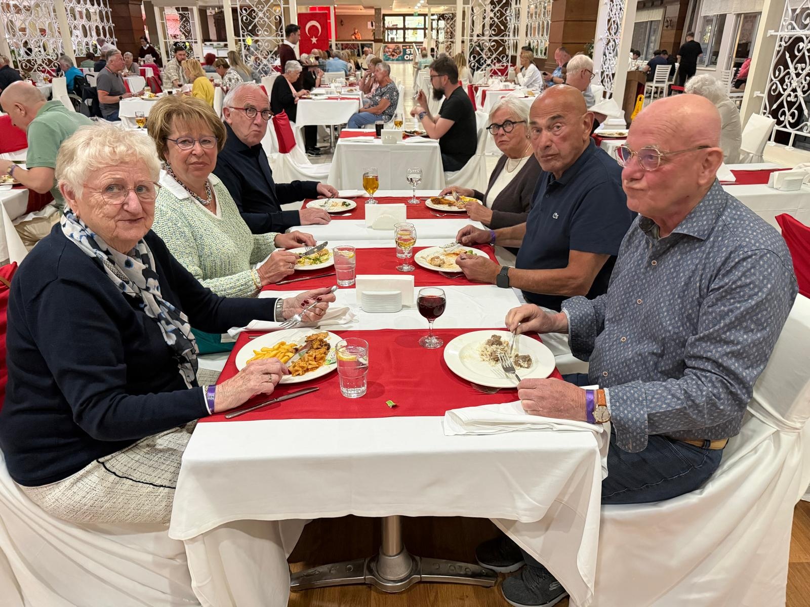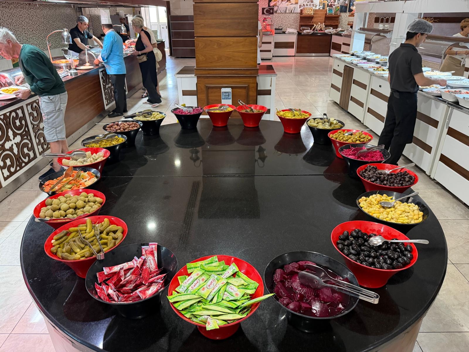 We hebben weer heerlijk gegeten. Het buffet in Linda Resort Hotel biedt iedere dag weer een ruime keuze aan gerechten. Vooral de Turkse specialiteiten en de gerechten van de grill worden door veel gasten gewaardeerd. Daarnaast is er een uitgebreid saladebuffet en een groot dessertbuffet met onder andere baklava en andere zoete lekkernijen. Voor iedereen is er wel iets naar smaak te vinden, waardoor ook het diner een gezellig onderdeel van de dag vormt. Het bord van Annemie is weer schoon op de haak 🙂 .