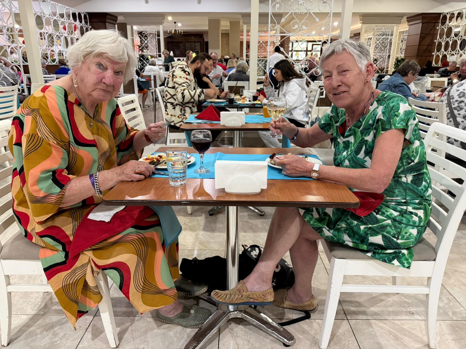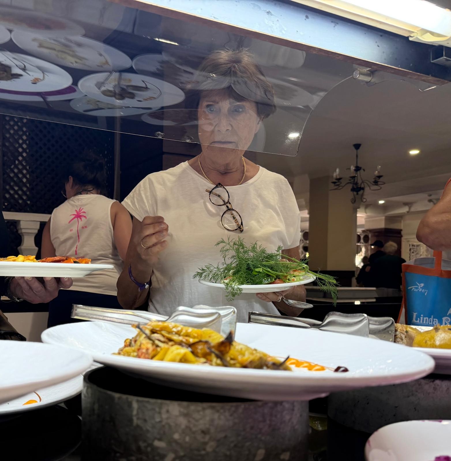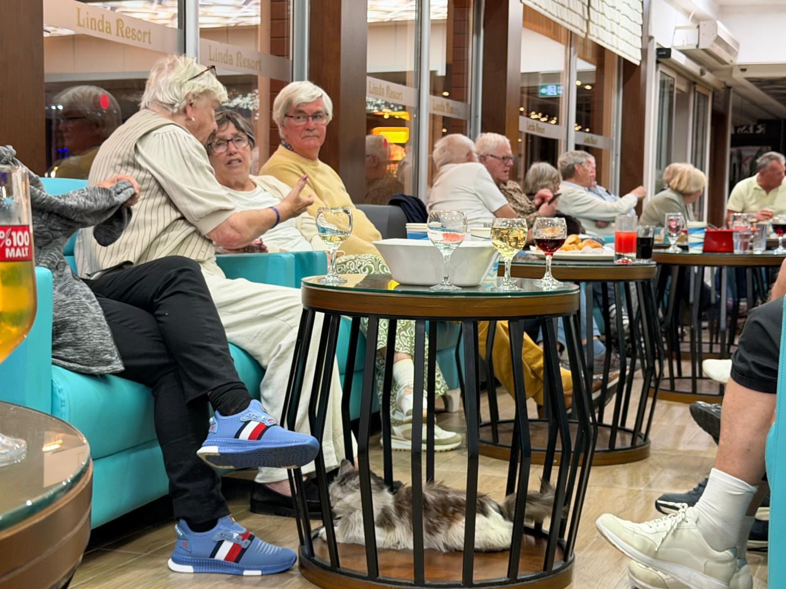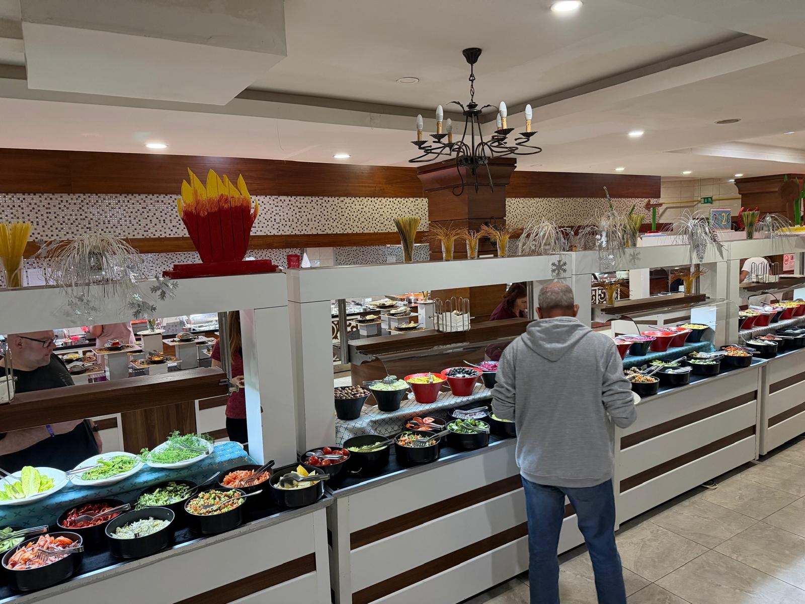 We hebben weer heerlijk gegeten. Het buffet in Linda Resort Hotel biedt iedere dag weer een ruime keuze aan gerechten. Vooral de Turkse specialiteiten en de gerechten van de grill worden door veel gasten gewaardeerd. Daarnaast is er een uitgebreid saladebuffet en een groot dessertbuffet met onder andere baklava en andere zoete lekkernijen. Voor iedereen is er wel iets naar smaak te vinden, waardoor ook het diner een gezellig onderdeel van de dag vormt. Het bord van Annemie is weer schoon op de haak 🙂 .