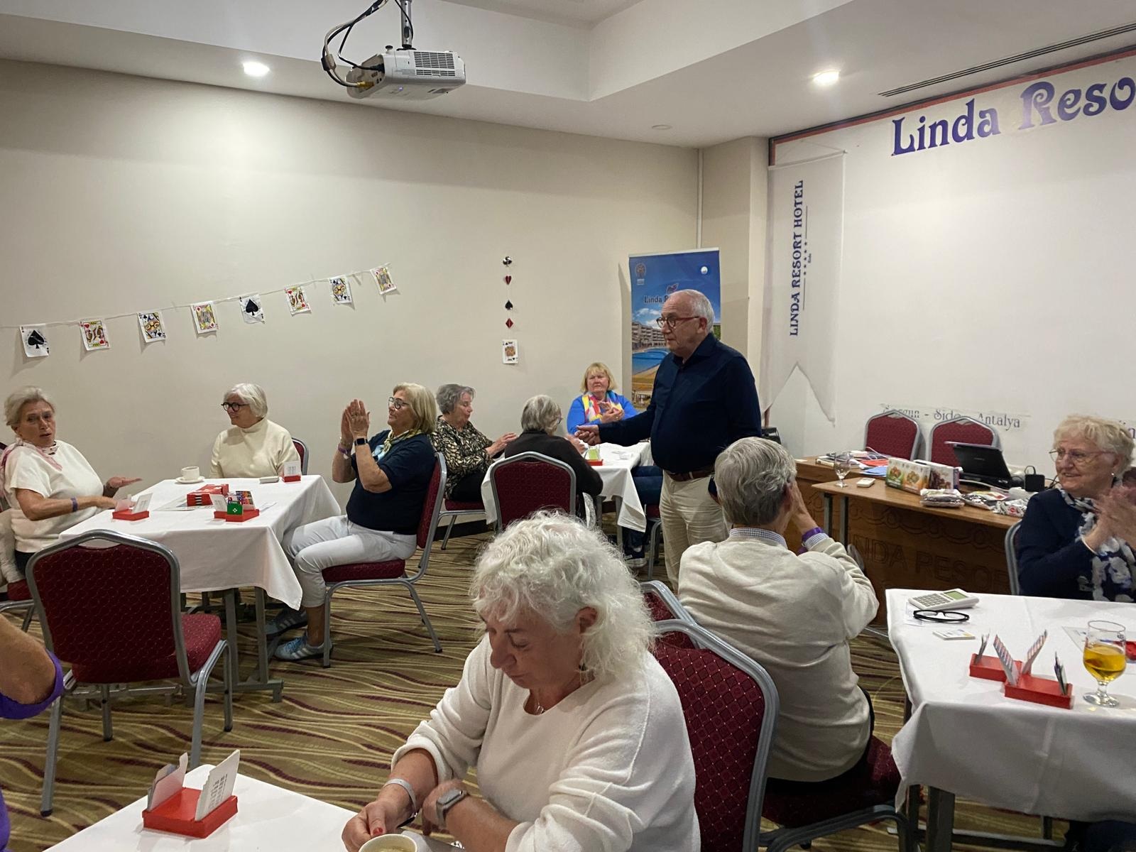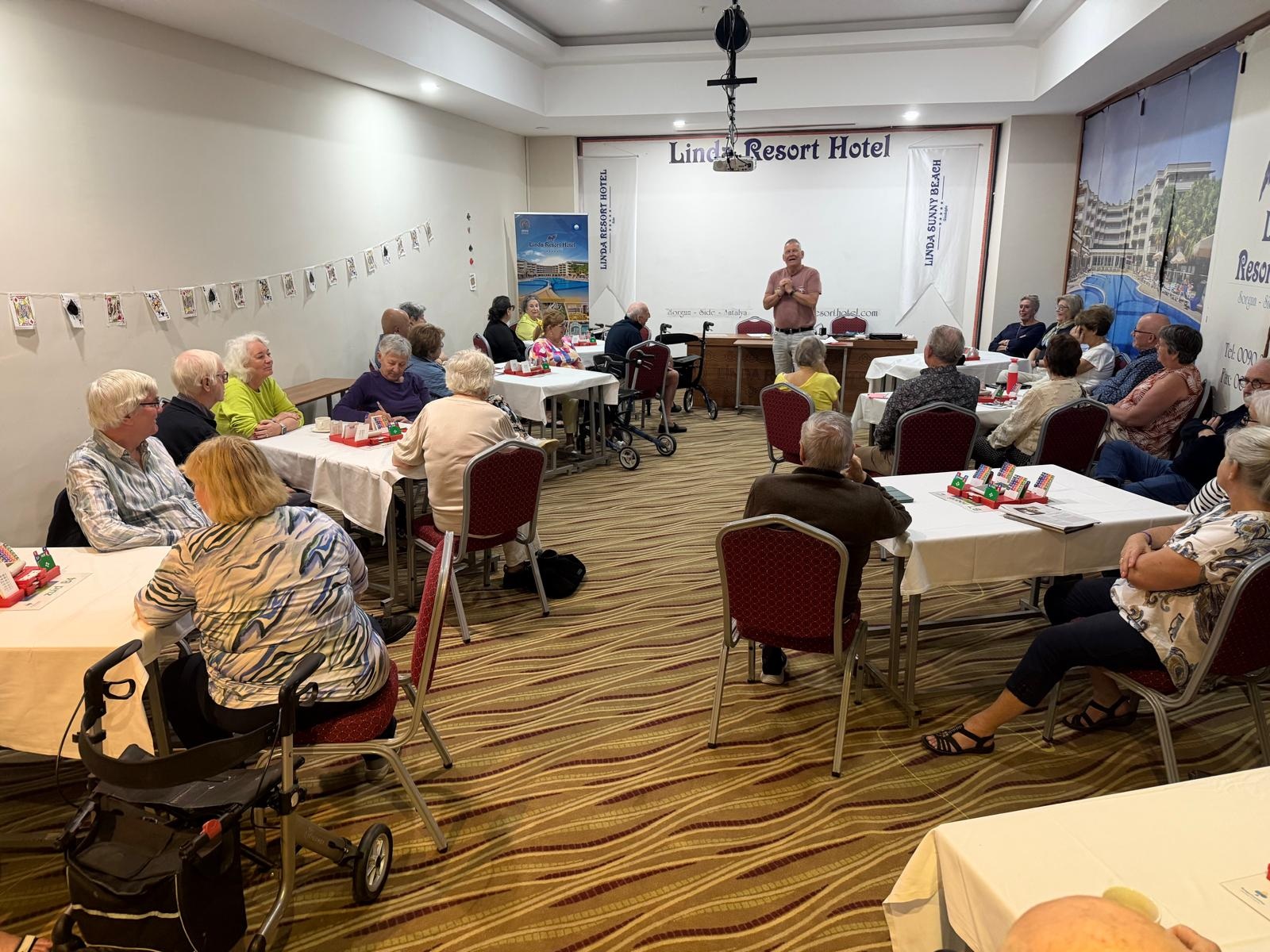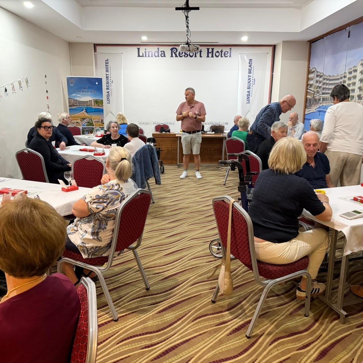 Na het welkom van BridgeTravelling heeft Gulsah van Corendon wat verteld over Side, de markt in Manavgat en alle gebruikelijke dingen. Vervolgens heeft ze ons geïnformeerd over drie excursies. Nadat we alle gemeenschappelijke vragen hadden gesteld konden de gasten inschrijven voor de excursies. Nu iedereen heeft ingeschreven komen ze zo terug om te betalen en gaan we lunchen.