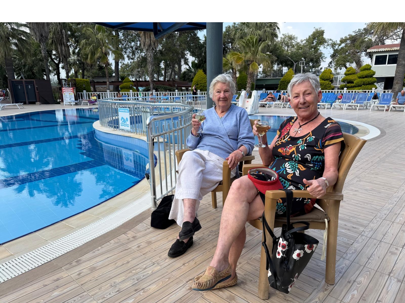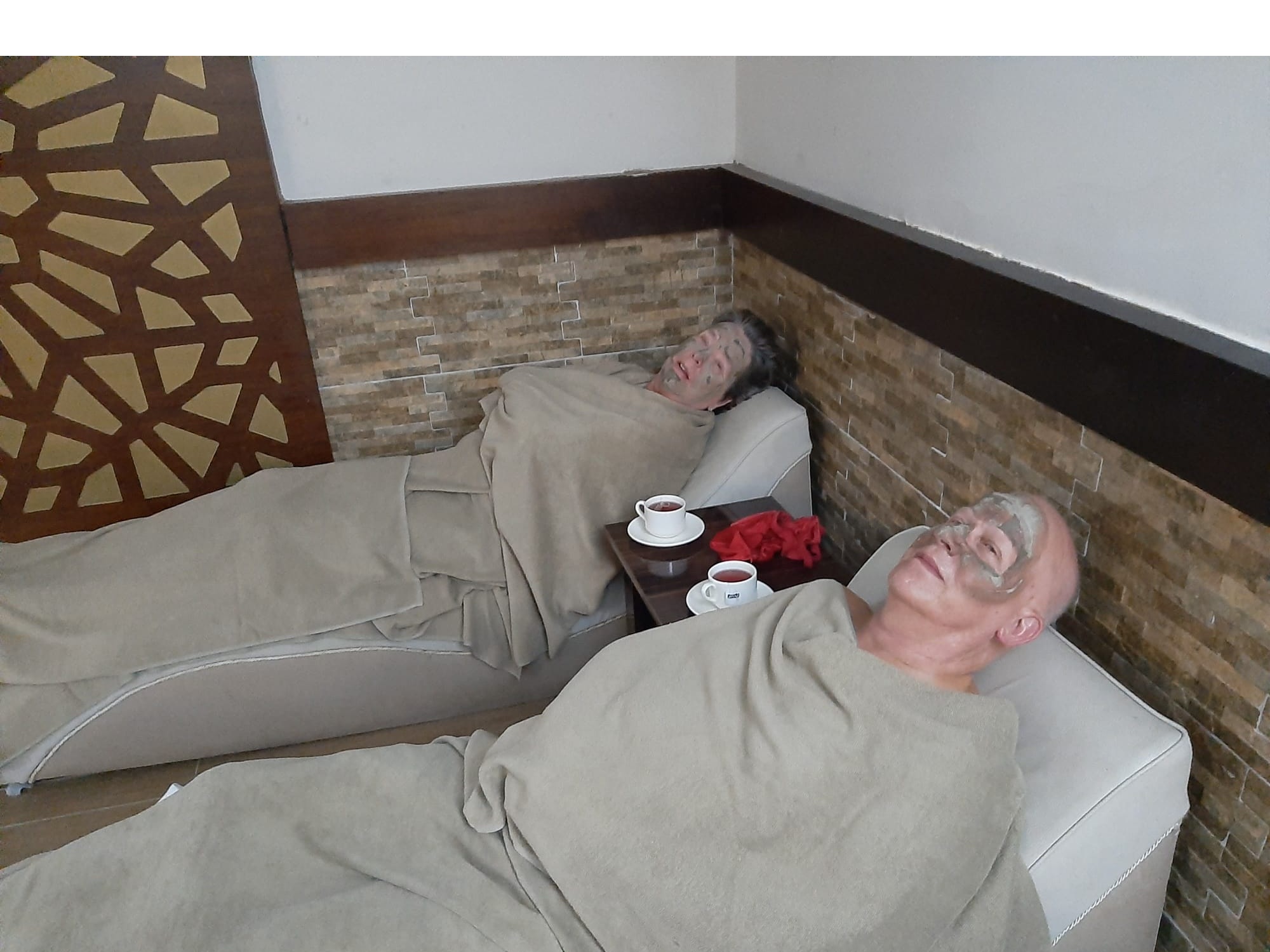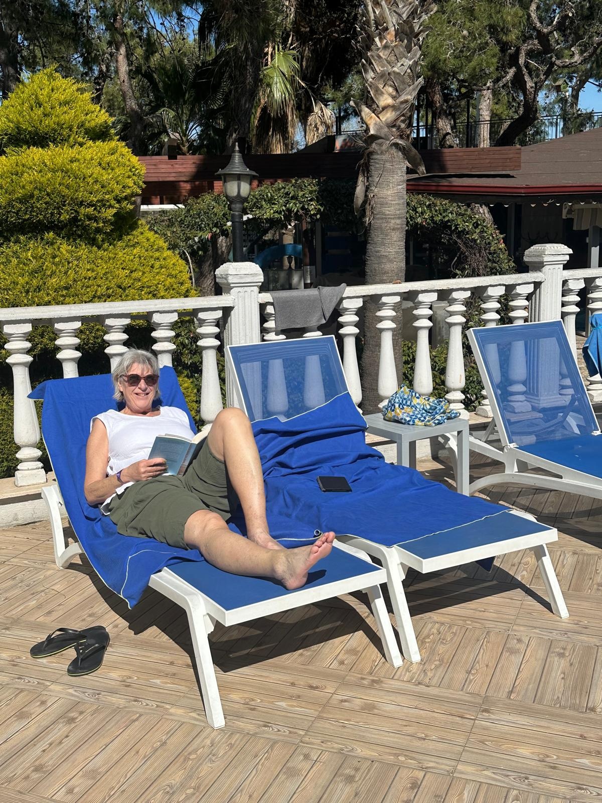 Na de lunch heerlijk met een boekje aan het zwembad in de zon. Een bezoek aan de Hamam in het hotel stond op de agenda van Hans en Frietsje.
