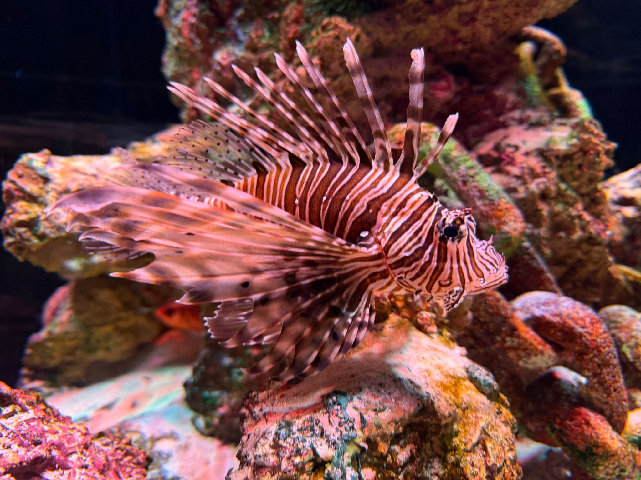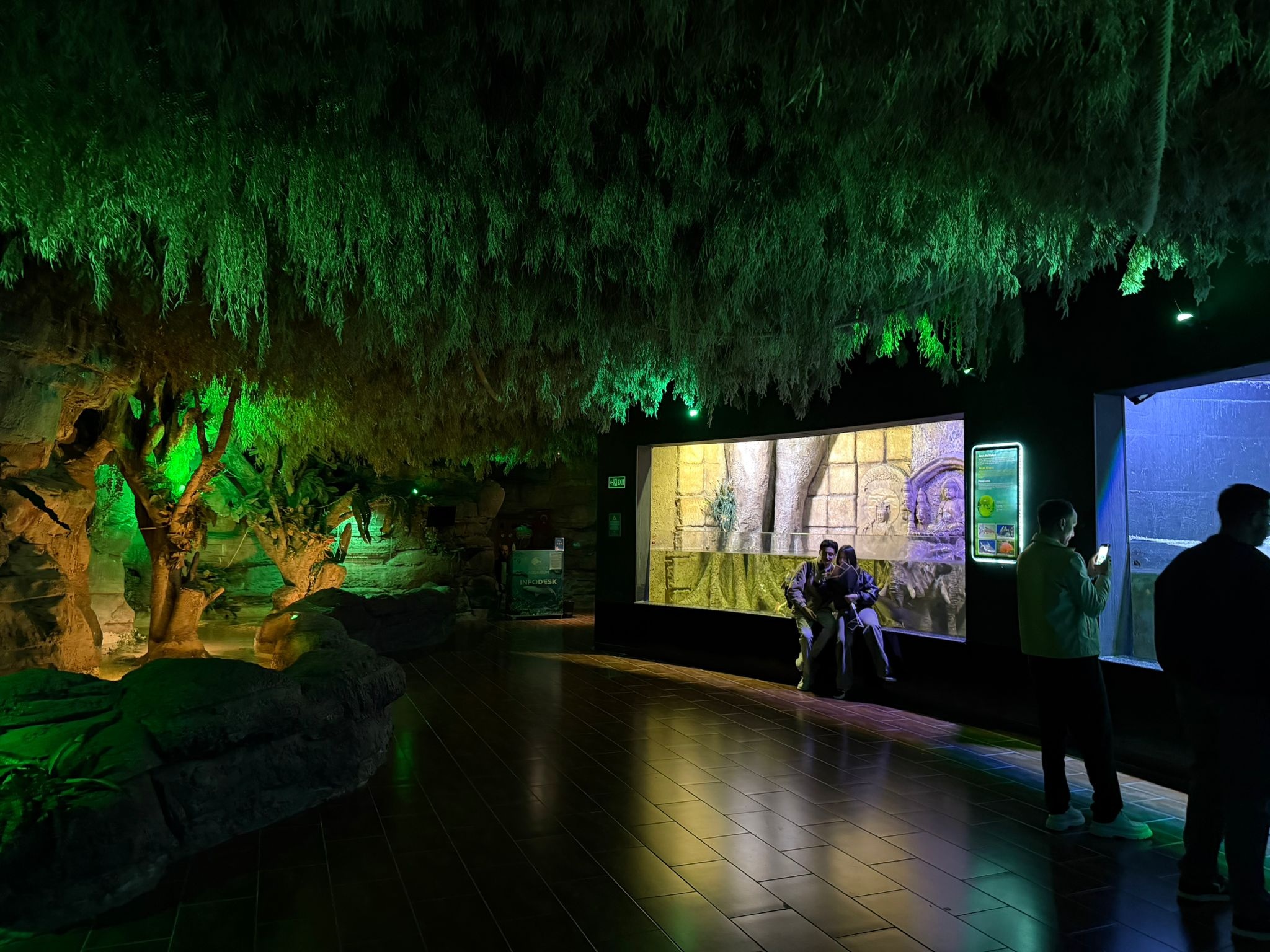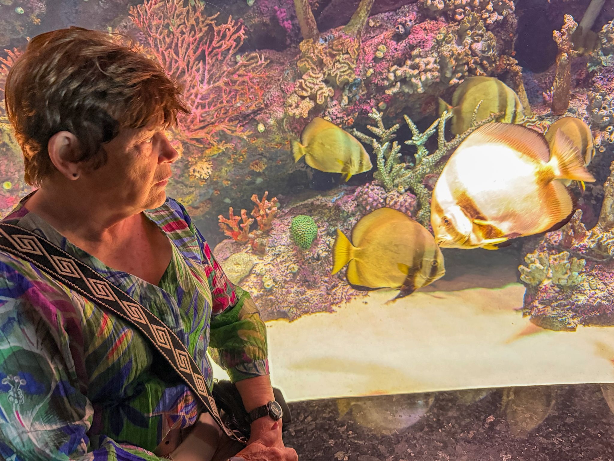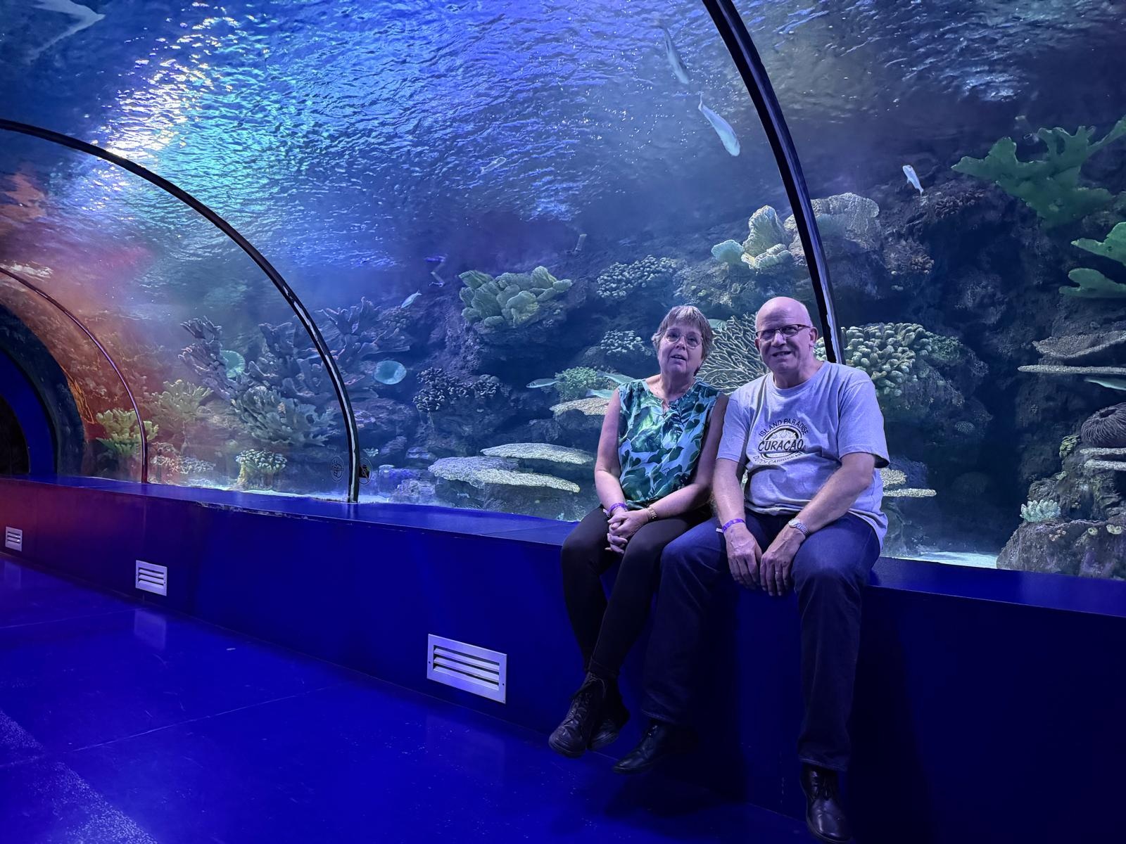 Na de lunch stappen we in de bus en gaan op weg naar het aquarium. We lopen door een 131 meter lange tunnel. Overal om je heen zie je exotische koralen, waterplanten, gigantische vissen en allerlei soorten zeedieren.