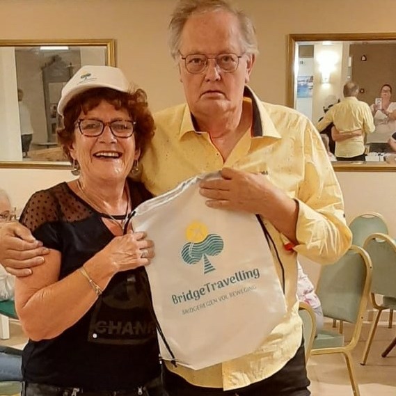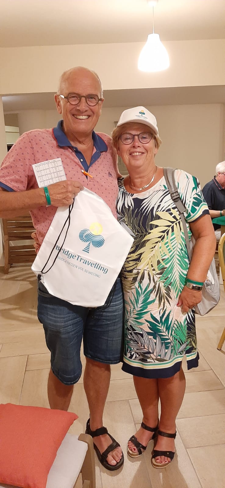 De dagwinnaars – Gerry en Kees – worden beloond met de BridgeTravelling (BT) trofees. Van harte! Hierna drinken we nog een drankje en verdwijnen dan langzaamaan aan naar de kamers. Naar de uitslag.