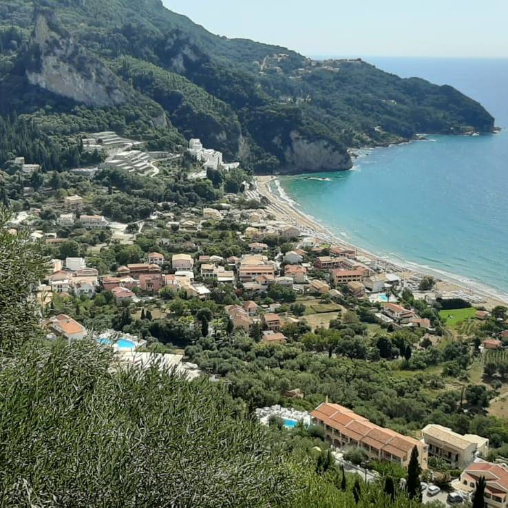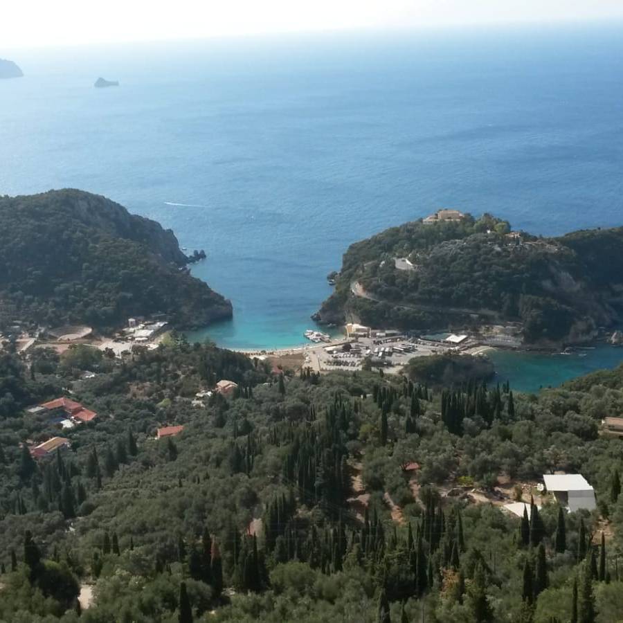 Via prachtige wegen en vergezichten gaan we naar Paleokastitsa maar maken eerste een fotostop. Paleokastritsa heeft 2 prachtige baaien met in het midden een groen schiereiland.