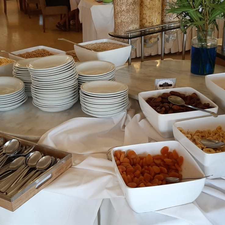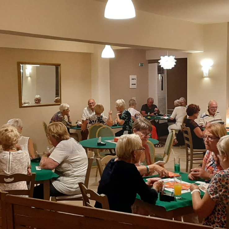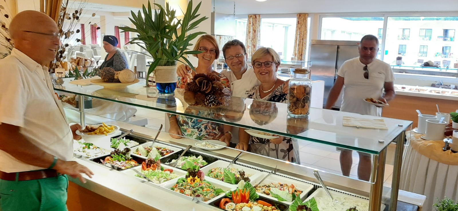 Bij aankomst in het restaurant hoeven we niet zoeken naar een tafel. Op onze tafels staat een kaartje gereserveerd. Op ons verzoek is dit geregeld om gezellig in het bijzijn van elkaar te eten en meteen de dagervaringen uit te wisselen. Bridge staat tenslotte voor verbinden oftewel bruggen slaan. Op veel onderdelen zoals ook het gezamenlijk maken van excursies is dit een succes en ontstaat er een leuke groepssfeer. Onze visie op het hebben van een fijne bridgevakantie. We doen ons goed aan het uitgebreide dinerbuffet en verheugen ons op de 3e competitieavond.