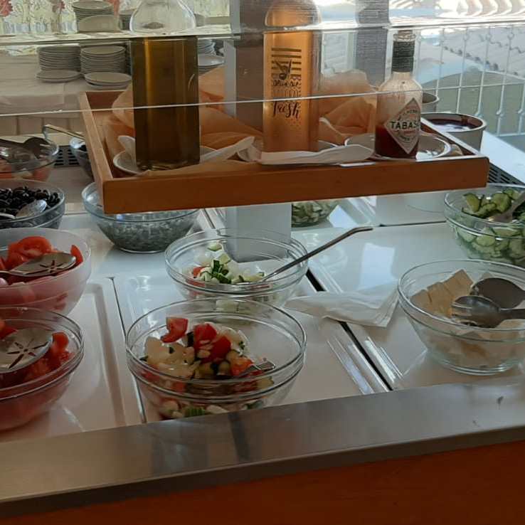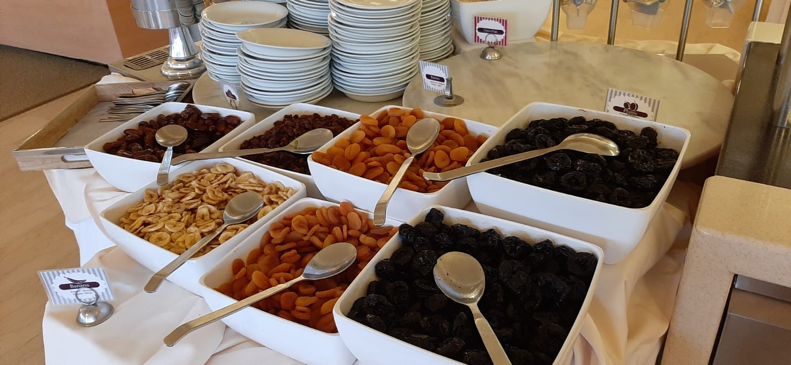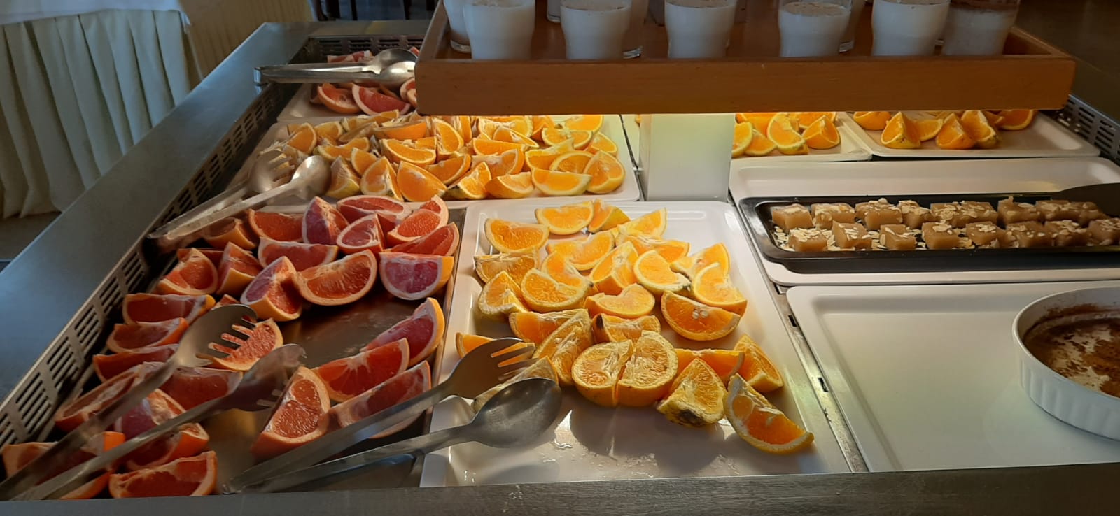 Het dinerbuffet is kleurrijk, zeer gevarieerd en smakelijk. We hebben in het achterste restaurant onze eigen tafels. Veel vleessoorten en groentes worden aangeboden en er is een uitgebreid saladebuffet. Het puntje op de i zijn de heel veel soorten toetjes en fruit. Het neusje van de zalm gaan we de komende dagen ontdekken. Al met al; niets te klagen 🙂 .