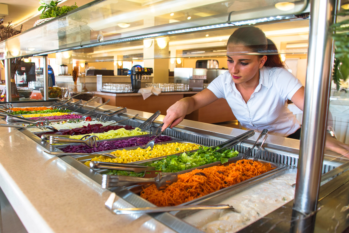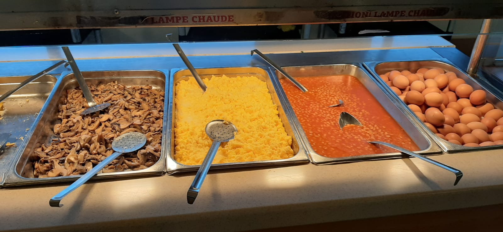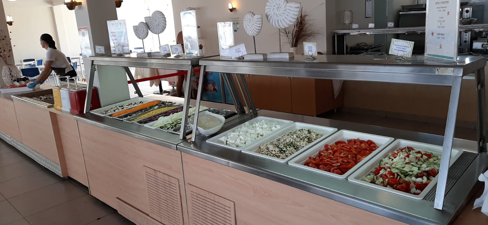 Het dinerbuffet is kleurrijk, zeer gevarieerd en smakelijk. We hebben in het achterste restaurant onze eigen tafels. Veel vleessoorten en groentes worden aangeboden en er is een uitgebreid saladebuffet. Het puntje op de i zijn de heel veel soorten toetjes en fruit. Het neusje van de zalm gaan we de komende dagen ontdekken. Al met al; niets te klagen 🙂 .