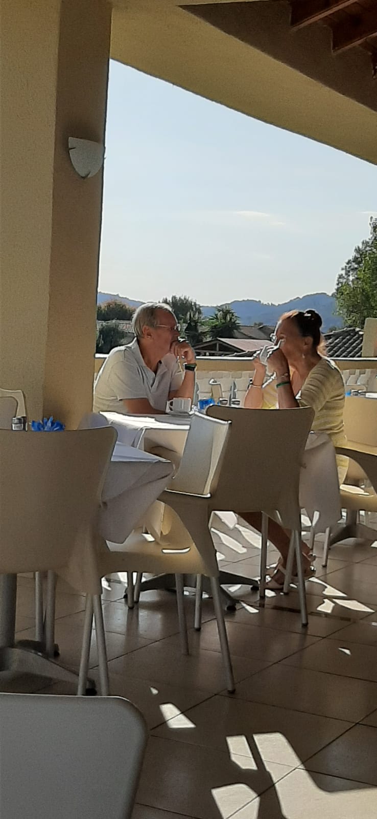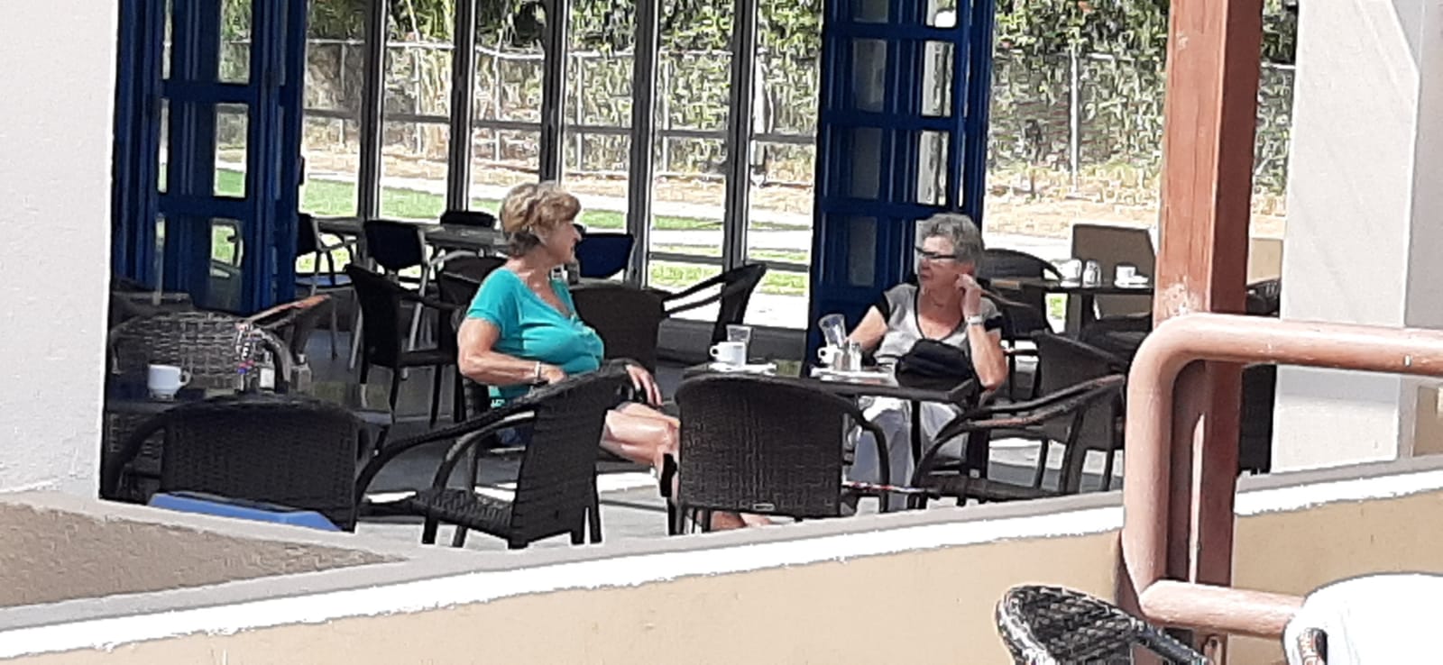 Vandaag blijft het zonnig en droog. Vanmiddag stijgt de temperatuur tot 25 °C en is de wind zwak, windkracht 2. Het ideale vakantieweer! Zowel op het terras met prachtig uitzicht op zee als binnen wordt ontbeten. Na het ontbijt trekt iedereen erop uit. Miep en Piet in het midden, de dagwinnaars van gisteren.