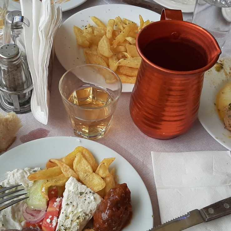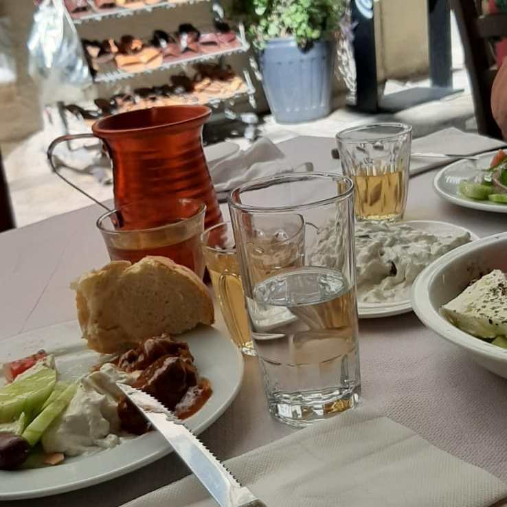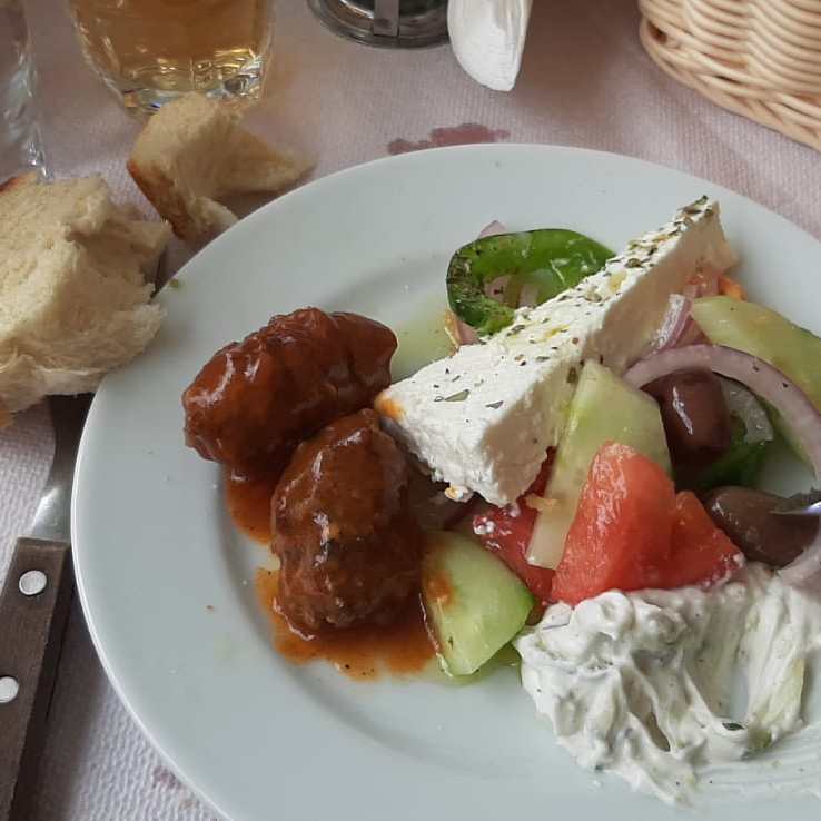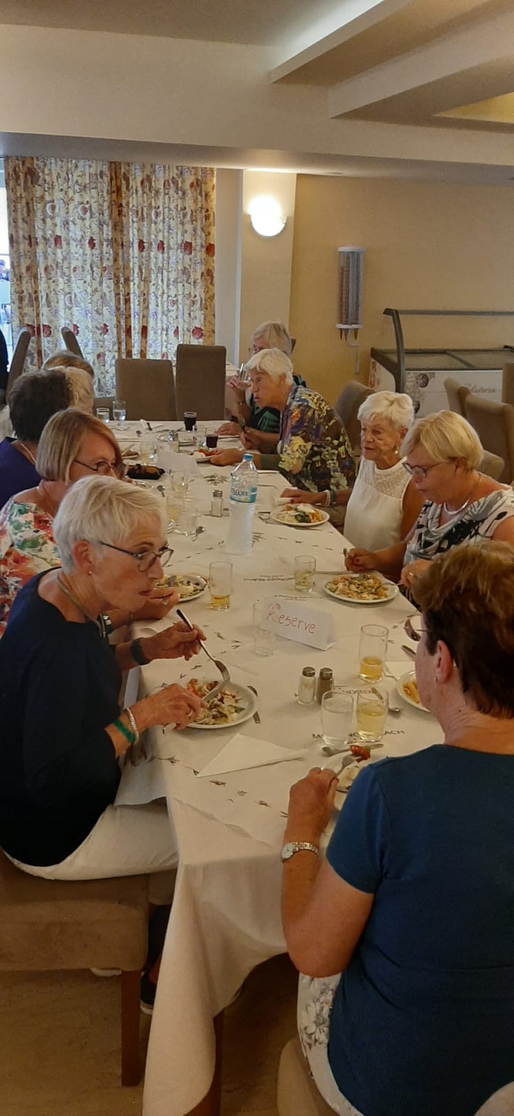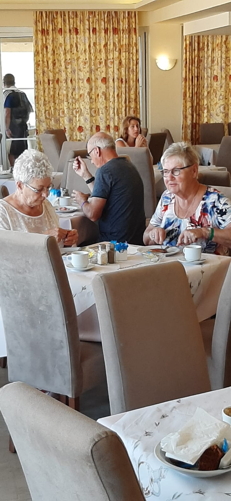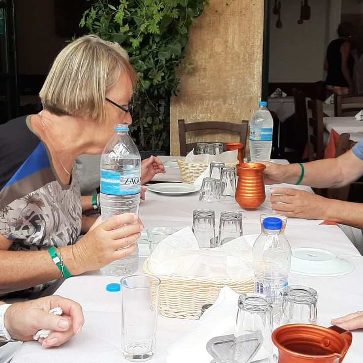 We hebben heerlijk geluncht! Het was heel gezellig en echt goed verzorgd met wijn en water, salade, tzatziki, gehaktballetjes, kip, patatjes en brood. Als klap op de vuurpijl; een appel-kaneel-puddingtaartje. Och, och, och! Na de lunch gaan we richting het hotel.