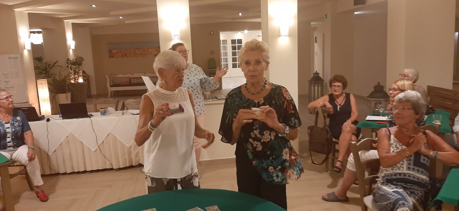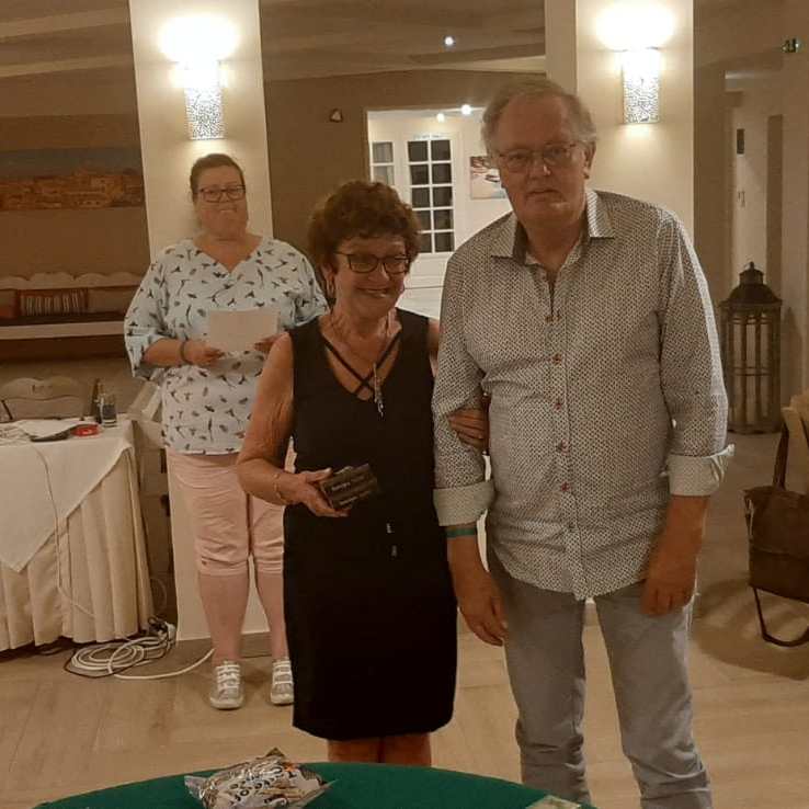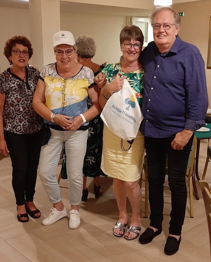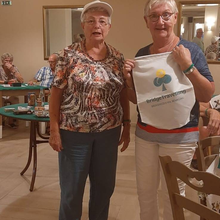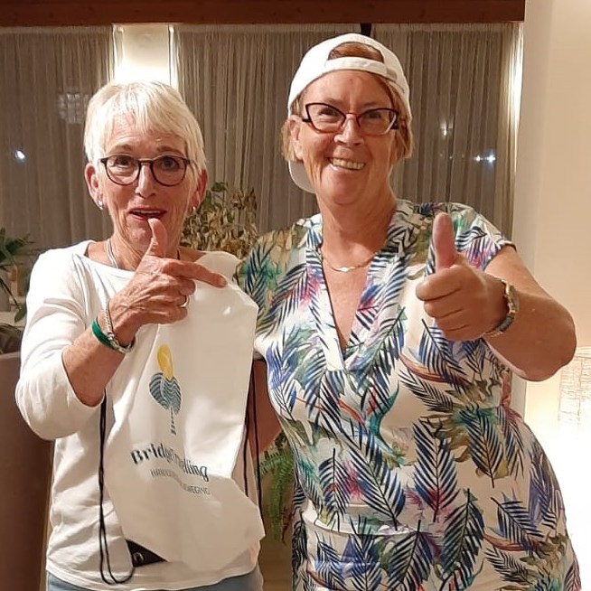 We spelen onze allerlaatste 24 spelletjes van de competitie. De sfeer in de groep is aangenaam prettig. Het is enig om tijdens een bridgevakantie nieuwe contacten op te doen. Hierdoor is het spelen van bridge onlosmakelijk verbonden aan verbinden c.q. aansluiten aan een groep. De dagprijs gaat naar naar Corrie en Amy, als eerste eindigden Corrie van O en ik (Caroline). Feliflapstaart! Hierna gaan we over naar de winnaars van de competitie.