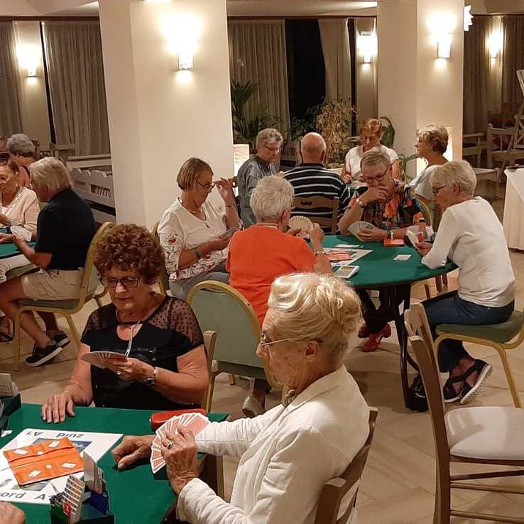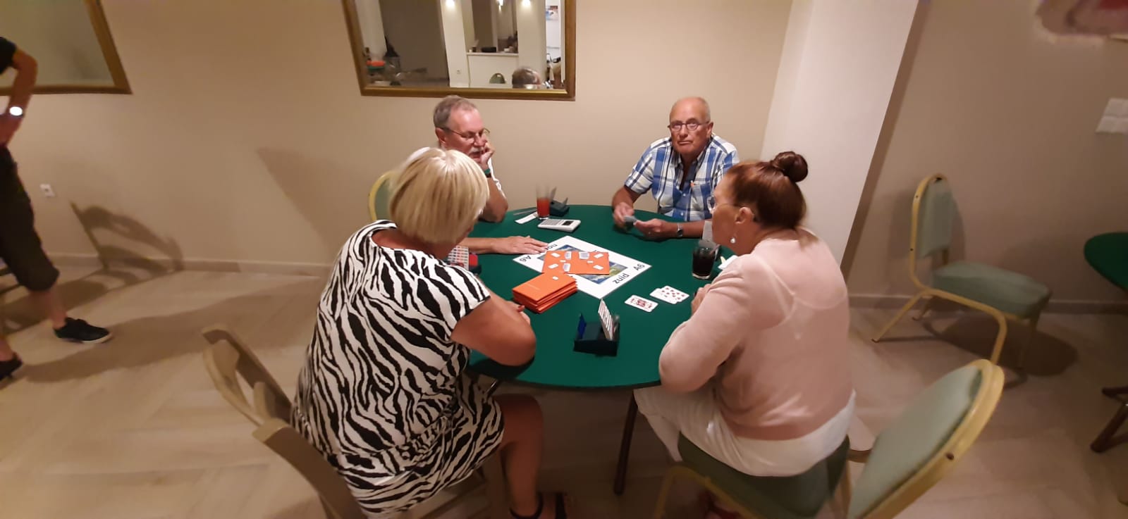 Na een enerverende dag pakken we om 18.00 uur de kaarten op. We spelen 2 ronden en zoeken dan het restaurant op. Een deel van de groep heeft vanmiddag laat uitgebreid geluncht, hierdoor worden de borden iets minder royaal toebedeeld dan de voorgaande dagen. Desondanks laat het ons weer heerlijk smaken en gaan hierna naar de bridgezaal terug voor de laatste spelletjes.