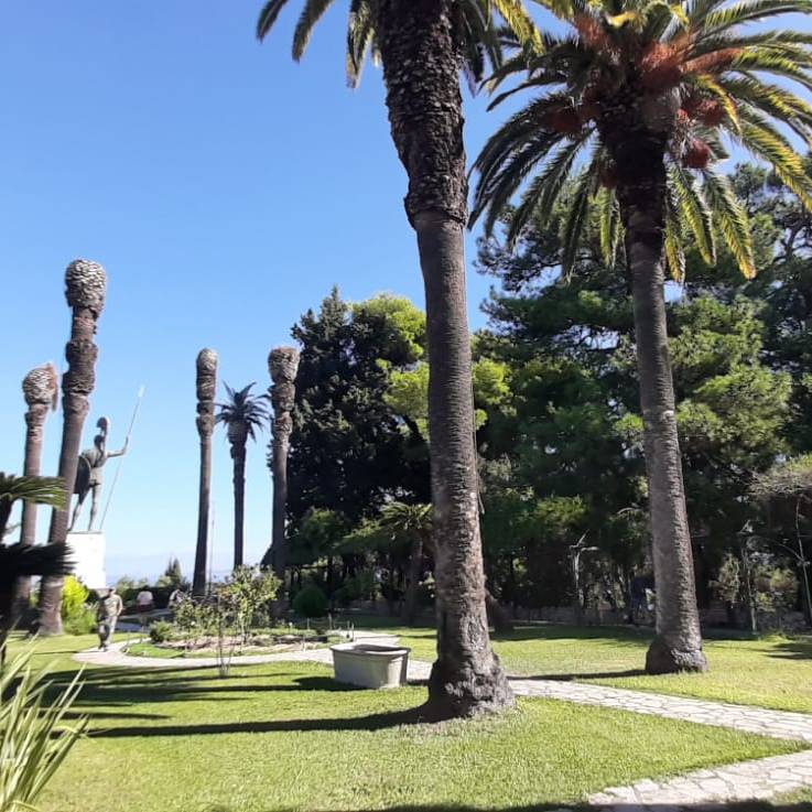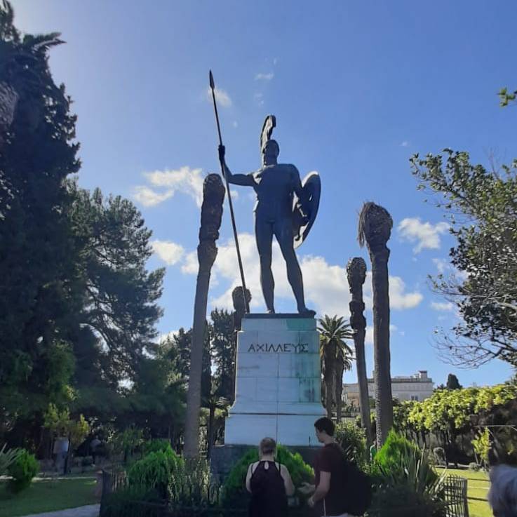 We zien o.a. een beeld van Achilles met pijl in hiel en uitzichten op Corfu stad. Deze tuin en uitzicht was waarom het paleis hier is gebouwd. De gids vertelt prachtig over de Griekse mythologie. Met de beelden en omgeving worden de godenverhalen zo levendig.