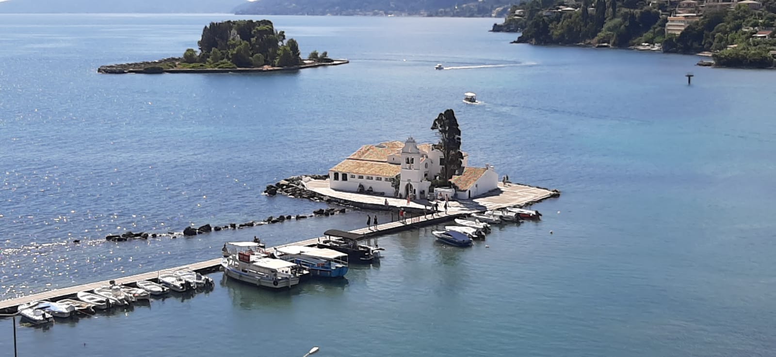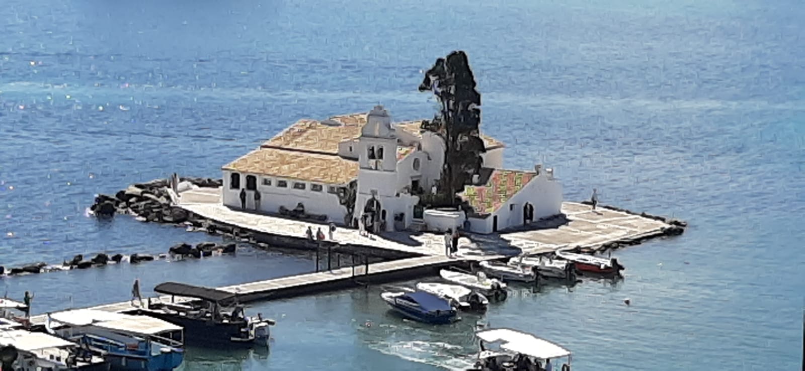 We rijden door naar Pontikonisi, oftewel het muizeneiland. Lopend gaan we naar het Vlacherna klooster aan de overkant. Dit klooster dateert uit de 17de eeuw. Het is een mooi wit gebouw, de eenzame cipres naast het klooster maakt het plaatje compleet. De terras-stop met mooi uitzicht op het klooster is een leuke pleisterplaats.