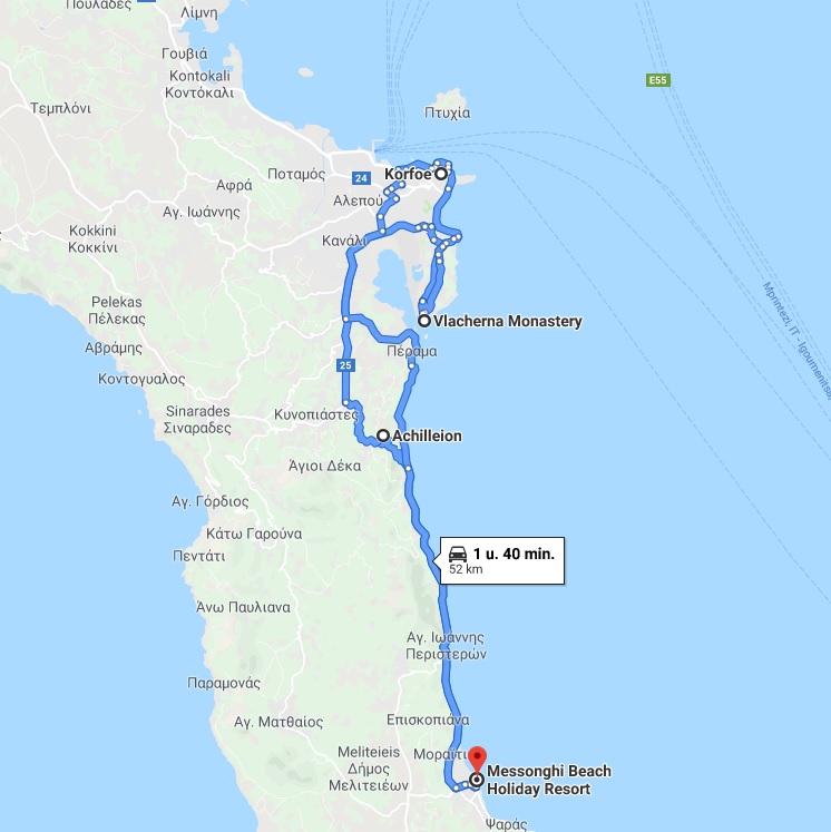 Corfu (Korfoe) is het noordelijkste en altijd groene Ionische eiland welke door een zeestraat, van nog geen twee kilometer breedte, van Albanië gescheiden is. Het landschap op Corfu is zeer afwisselend met een bergachtig noorden voor mooie wandelingen en vol met prachtige baaien en gezellige dorpjes. Het centrale gedeelte van het eiland Korfoe is heuvelachtig en in het zuiden kom je een laagvlakte tegen met veel olijfbomen en cipressen en het Korrisionmeer met watervogels en een prachtige natuur.