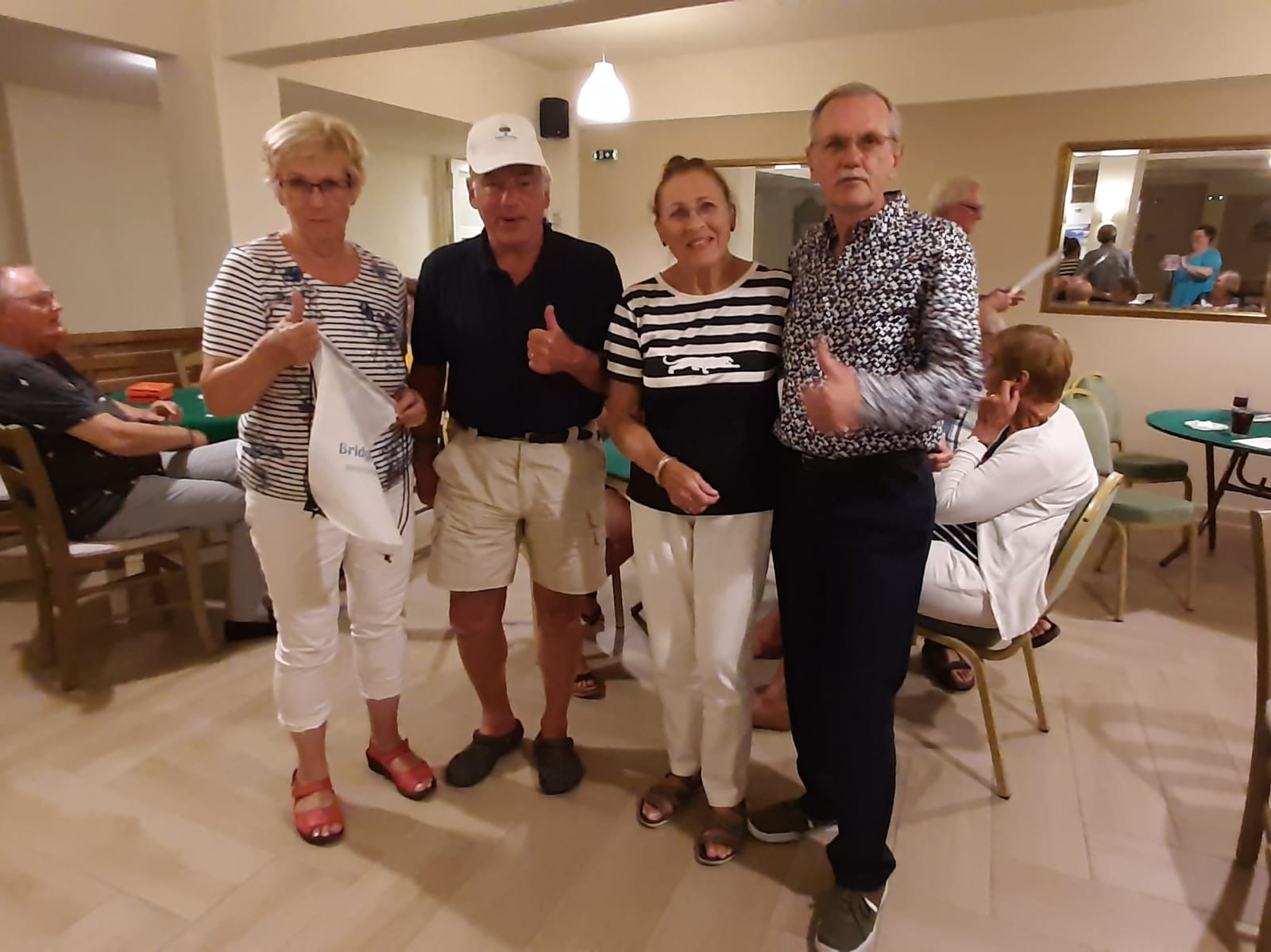 De felicitaties gaan naar de dagwinnaars Tonny en Louise (middelste twee op de foto). Zij zijn als 3e geëindigd. Nummer 1 (links en rechts op de foto) en 2 zijn al dagwinnaars geweest. Hierdoor schuiven de BT-trofees door. Naar de uitslag