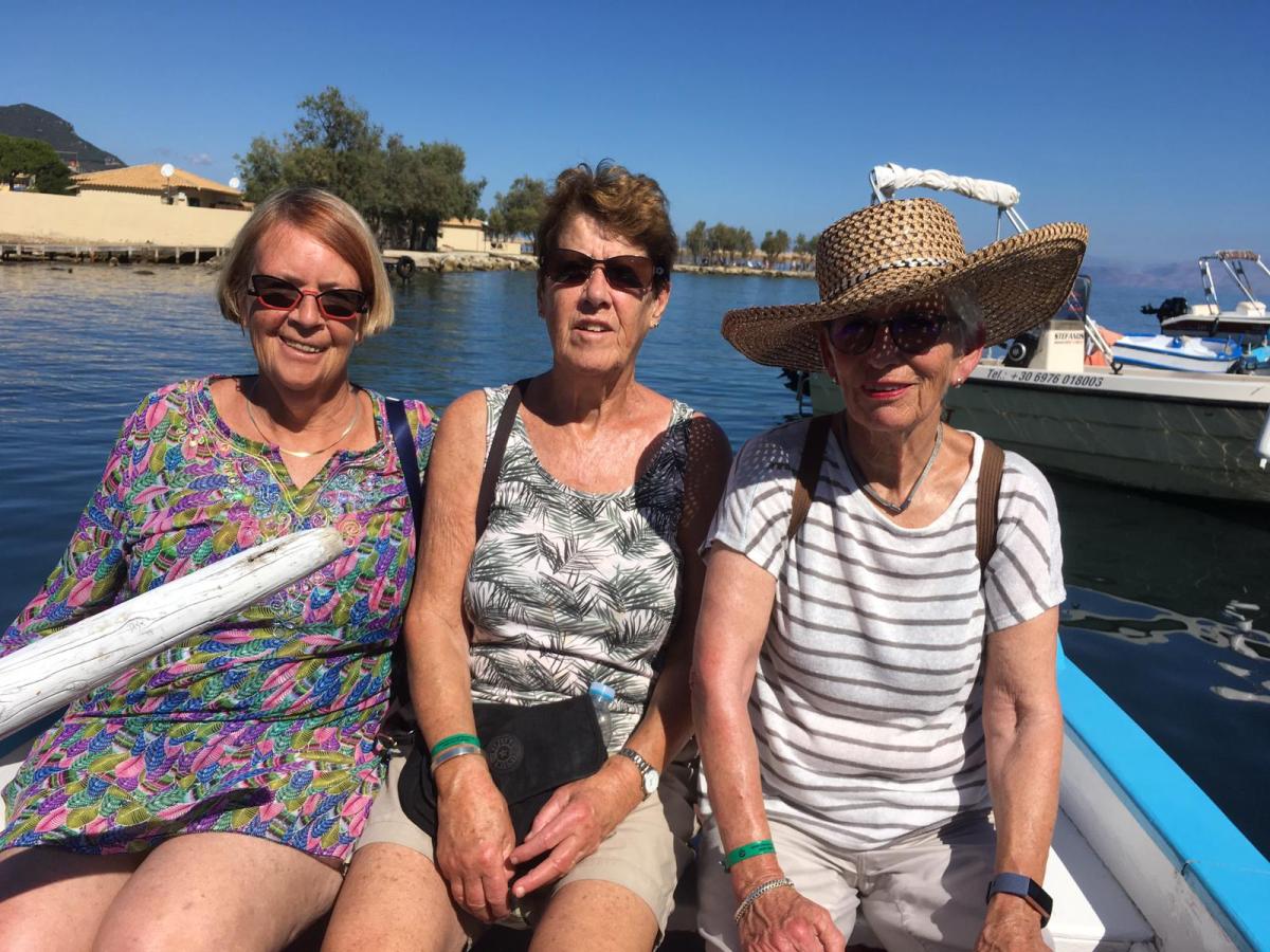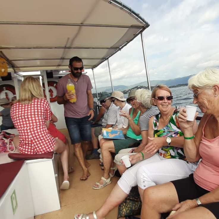We varen onder andere langs het paleis en geboortehuis van Phillip Montbatten, echtgenoot van de Britse Queen en langs Corfu, de oude vesting. We eten fruit, drinken water, sap en prosecco in overvloed. Het tussendoortje bestaat uit ouzo en chips. Nu maar hopen dat we in rechte lijn naar het hotel kunnen wandelen bij terugkomst in Messonghi of niet overboord vallen wanneer we de roeiboot instappen 🙂 . De stemming zit er in ieder geval goed in.