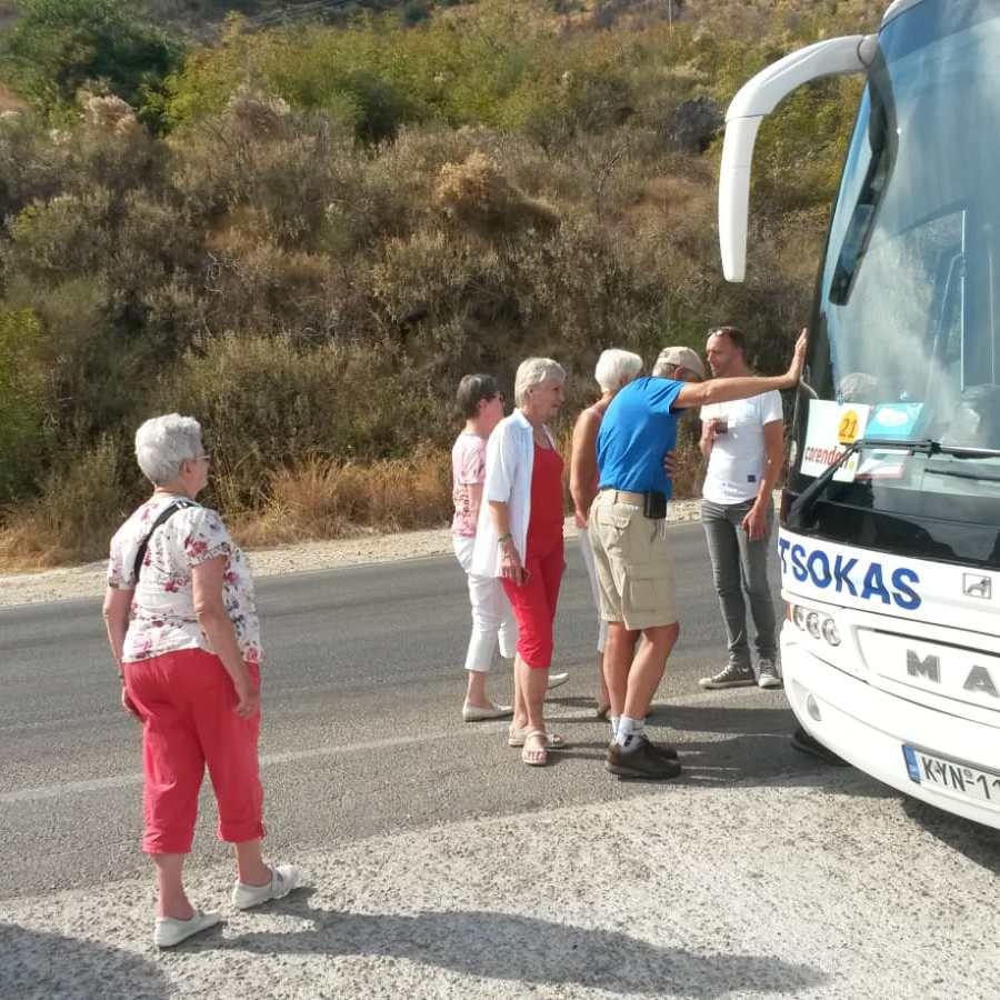 De gasten die meegaan met de toer moeten vroeg uit de veren 🙂 . De start van de toer verliep wat hobbelig. Het opstartpunt was bij de receptie maar er waren al wat gasten naar het hek aan de rand van het hotel gelopen. Nadat uiteindelijk iedereen in de bus zat moest na korte tijd iedereen er weer uit. De chauffeur had een technisch mankementje ontdekt. Een andere bus werd ingezet en de toer kon veilig verder worden ingezet.