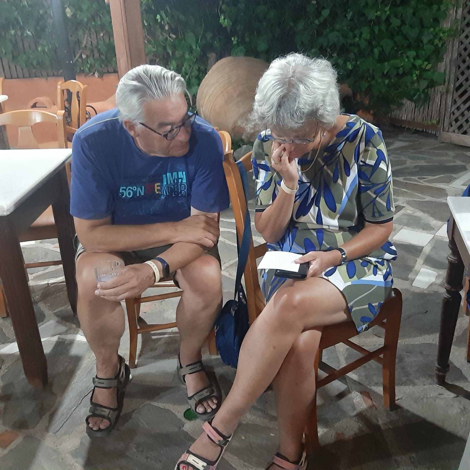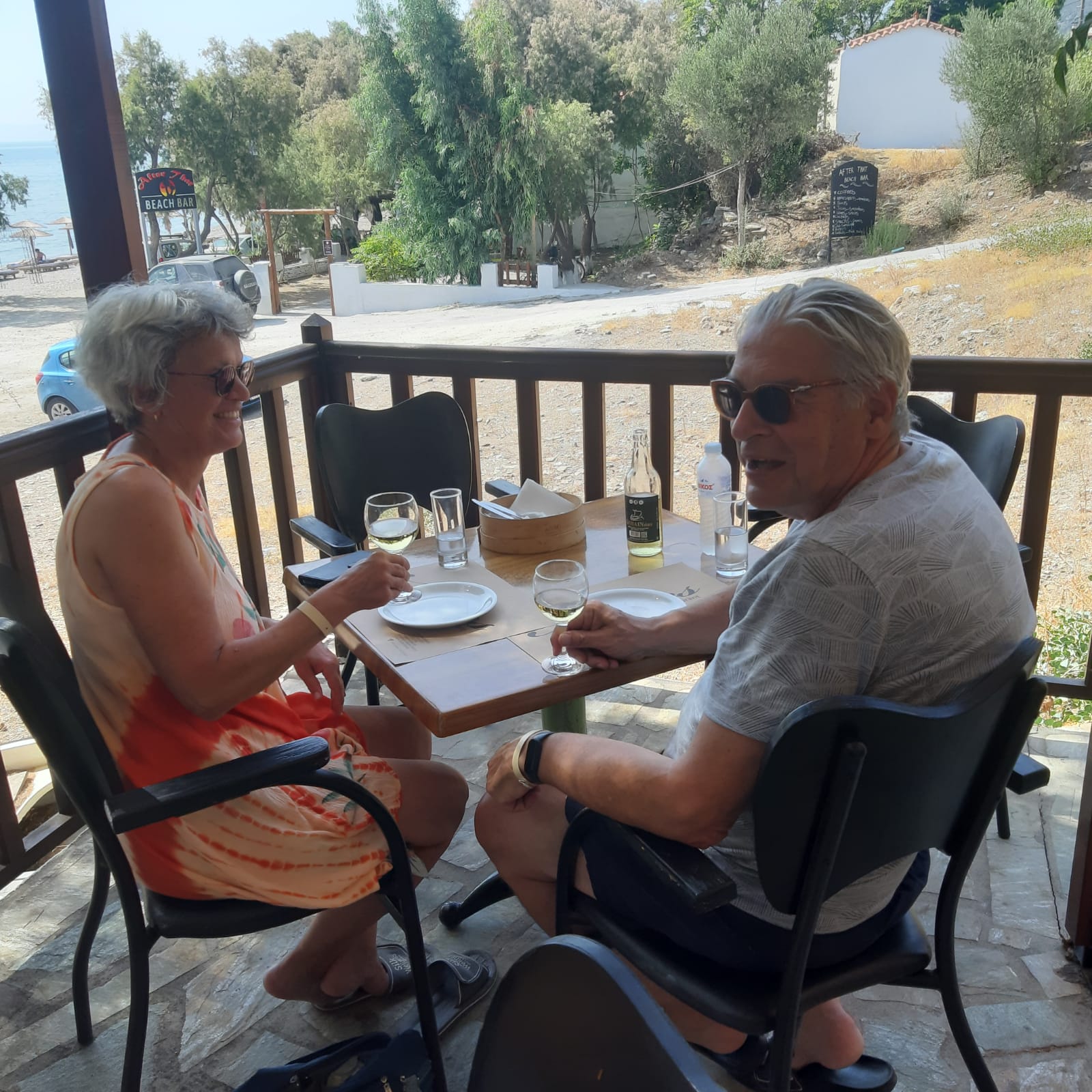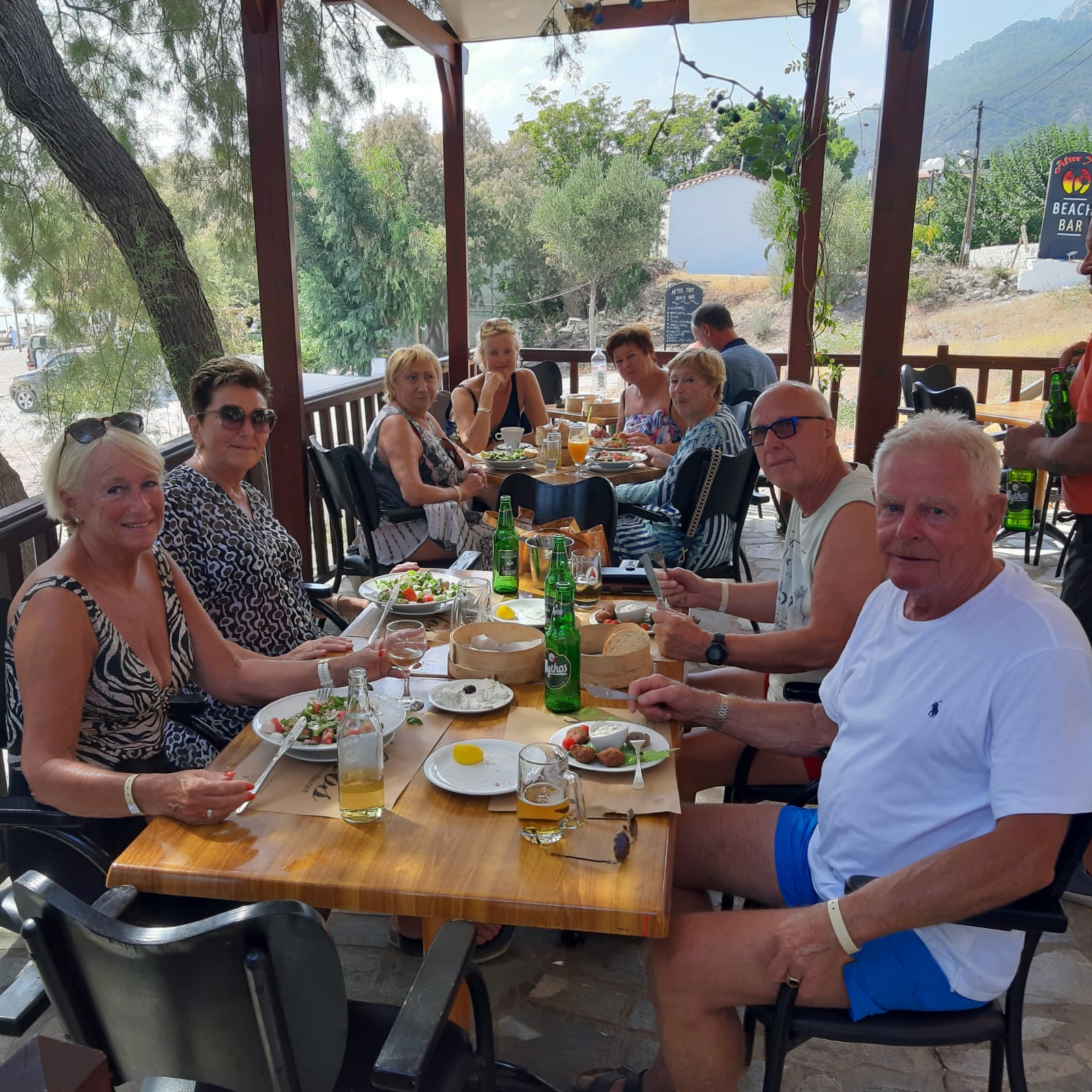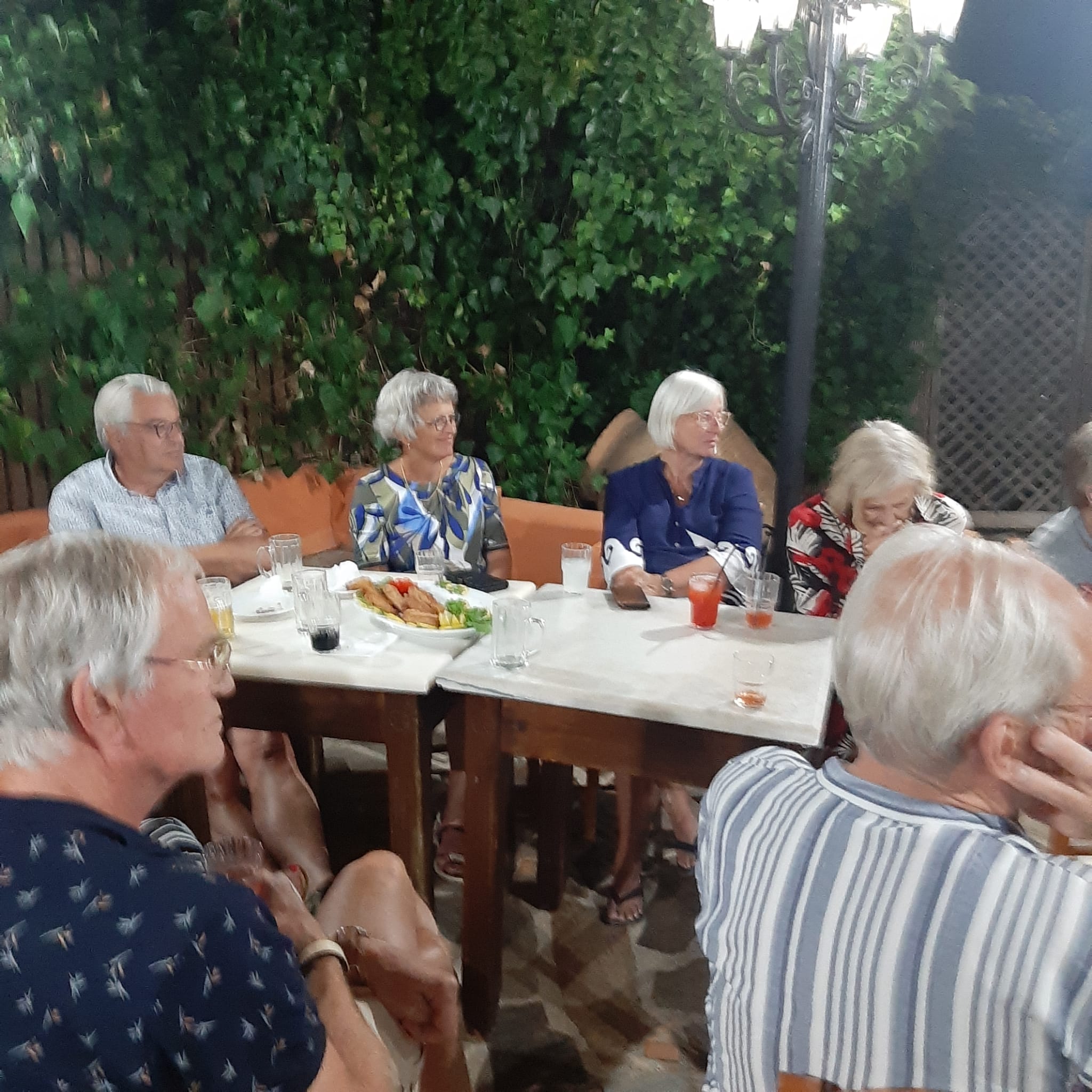 Je kon zien dat er gasten waren die toch nog wel wat vermoeid waren van gisteren. Er werd weinig ondernomen, behalve Cora en Corine die met een taxi naar Pythagorio zijn gegaan om dit stadje wat beter te leren kennen. Hiske heeft van haar koffie in het strandrestaurant genoten waar we met een stel gasten na de lunch getrakteerd werden op een eigen gebrouwd drankje. Ook zijn Hanny, Pieter en Roelof er weer met de auto vandoor om op verschillende plekken hier te gaan wandelen.