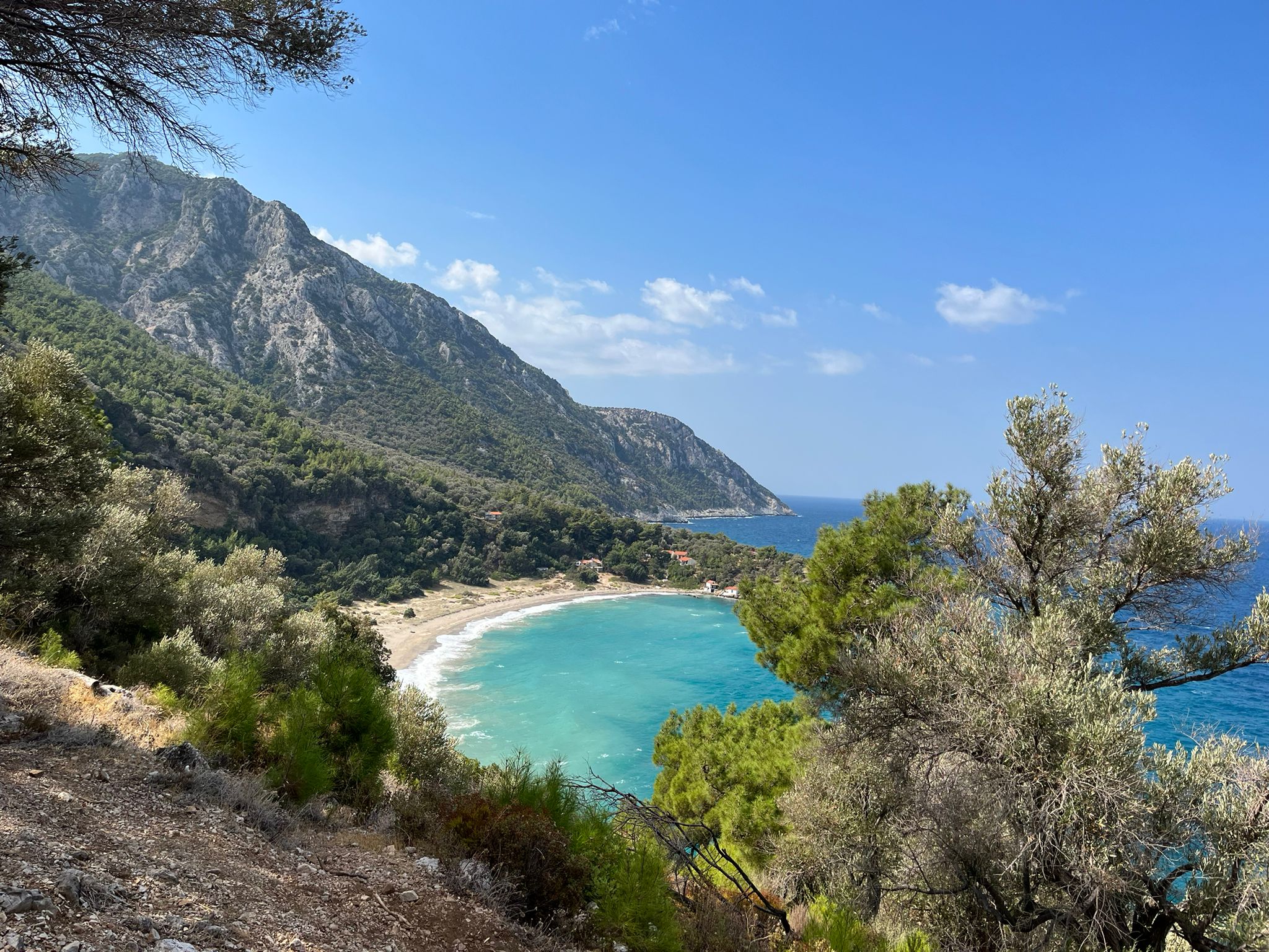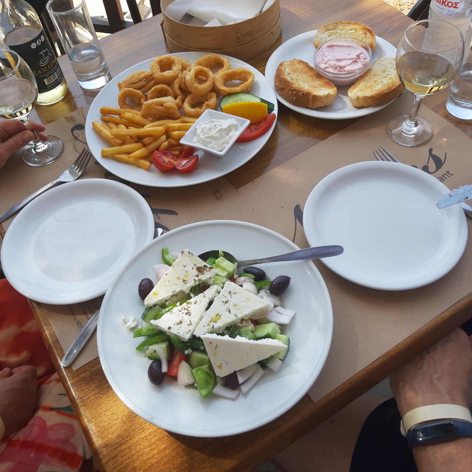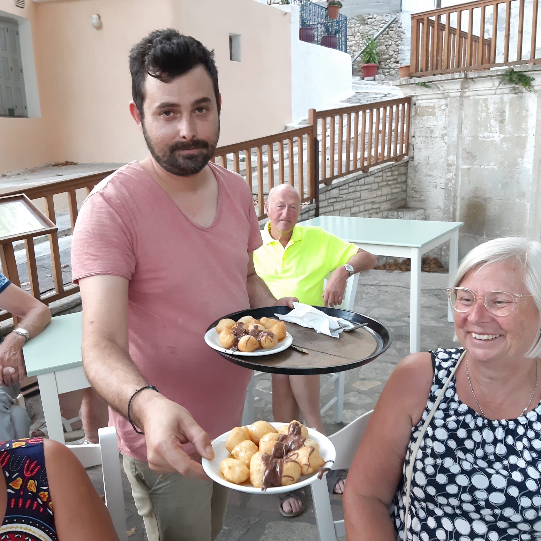 Als kers op de taart zijn we een heel klein dorpje ingereden, waar we lopend opeens op een prachtig groot plein terecht kwamen. Hier hebben we de loukoumades geproefd. Dit zijn kleine bolletjes met honing en chocolade die hier op het eiland vooral geserveerd worden bij bruiloften.