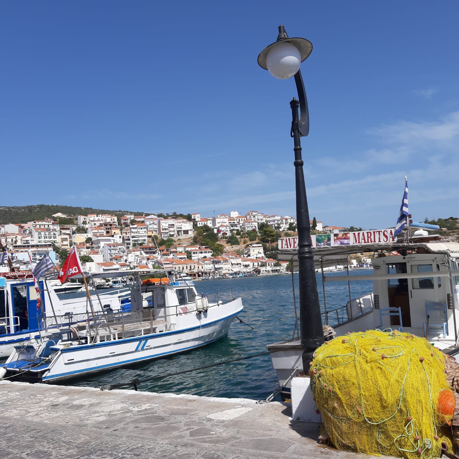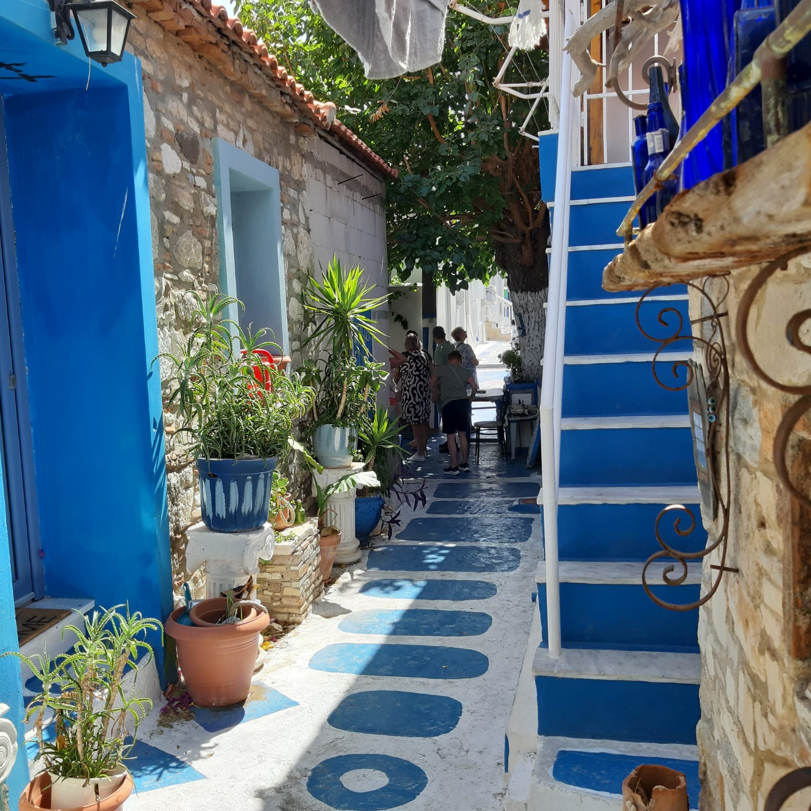 Ondertussen is het lunchtijd en zijn we in Pythagoras aangekomen. Eerst natuurlijk even naar het “blauwe straatje”, om vervolgens ergens heerlijk aan het water te gaan lunchen. Ook de grote winkelstraat werd druk bezocht.
