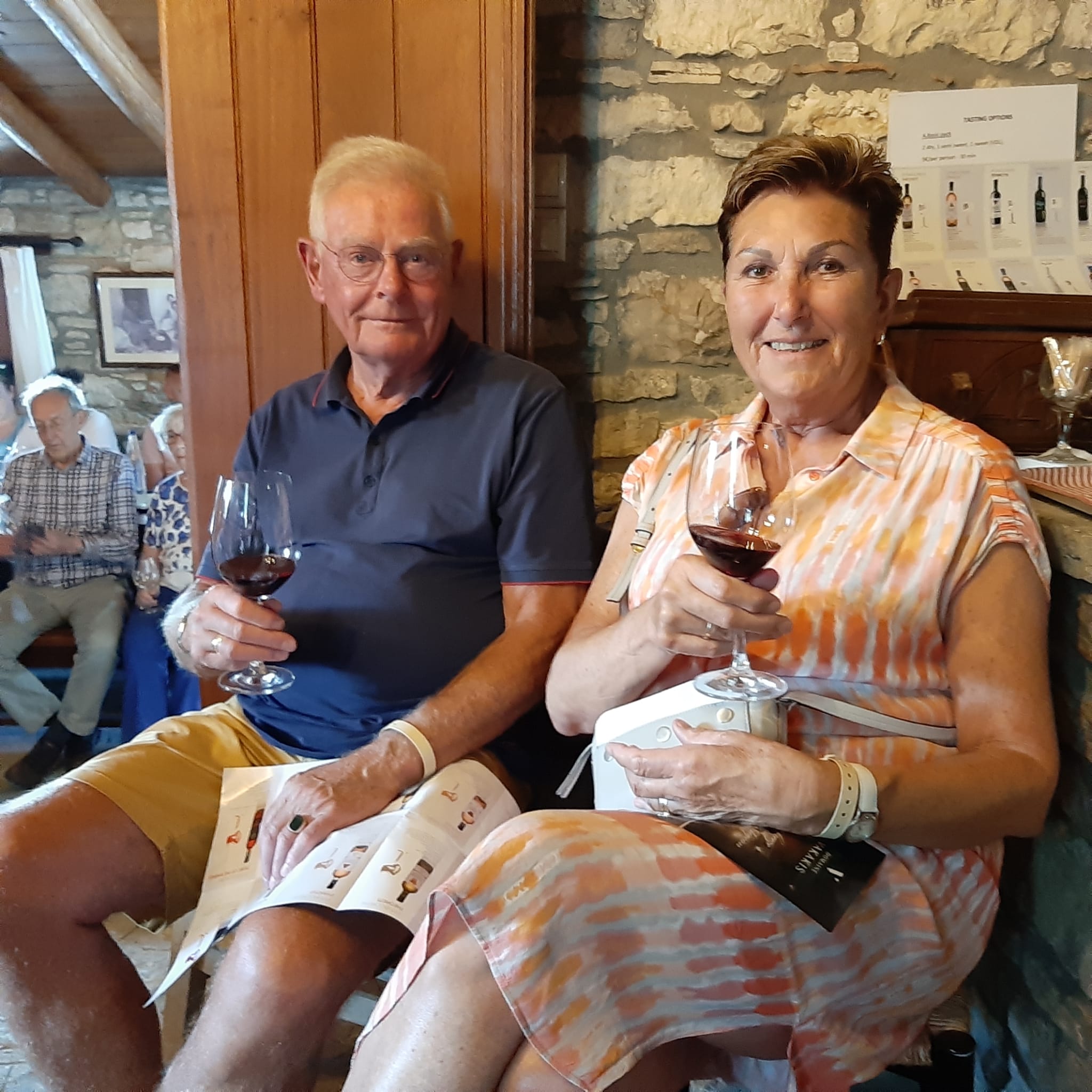 Toen werd het echt wel tijd voor een wijntje en daar is natuurlijk de wijnproeverij erg geschikt voor. We kregen allemaal 6 verschillende wijnen te proeven. 2 droge wijnen, 2 half zoet en 2 dessertwijnen. Natuurlijk met tussenpozen. Water en kleine hapjes werden tussendoor geserveerd. Een van deze wijnen wordt in het Vaticaan gebruikt tijdens de heilige mis daar.
