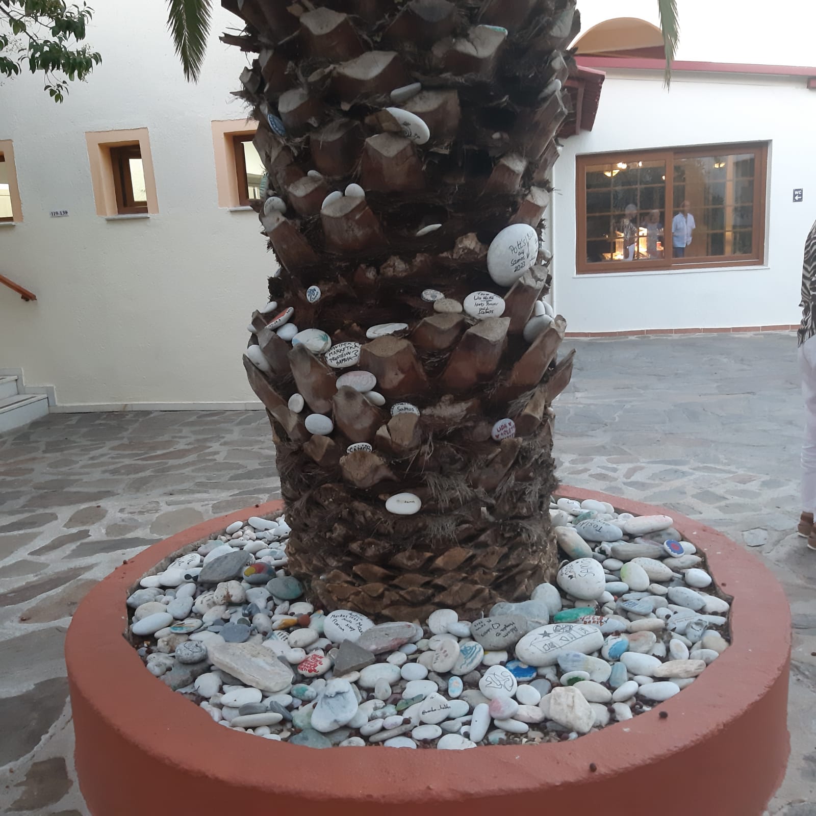 Je ziet hier op het resort ook allerlei stenen liggen met een tekst of namen. Wij hebben de steen die hier in mei is achtergelaten door Tanja en Anja daartussen ook gevonden. Jan heeft er vandaag ook een gemaakt en ook deze heeft bij de boom een plekje gekregen.