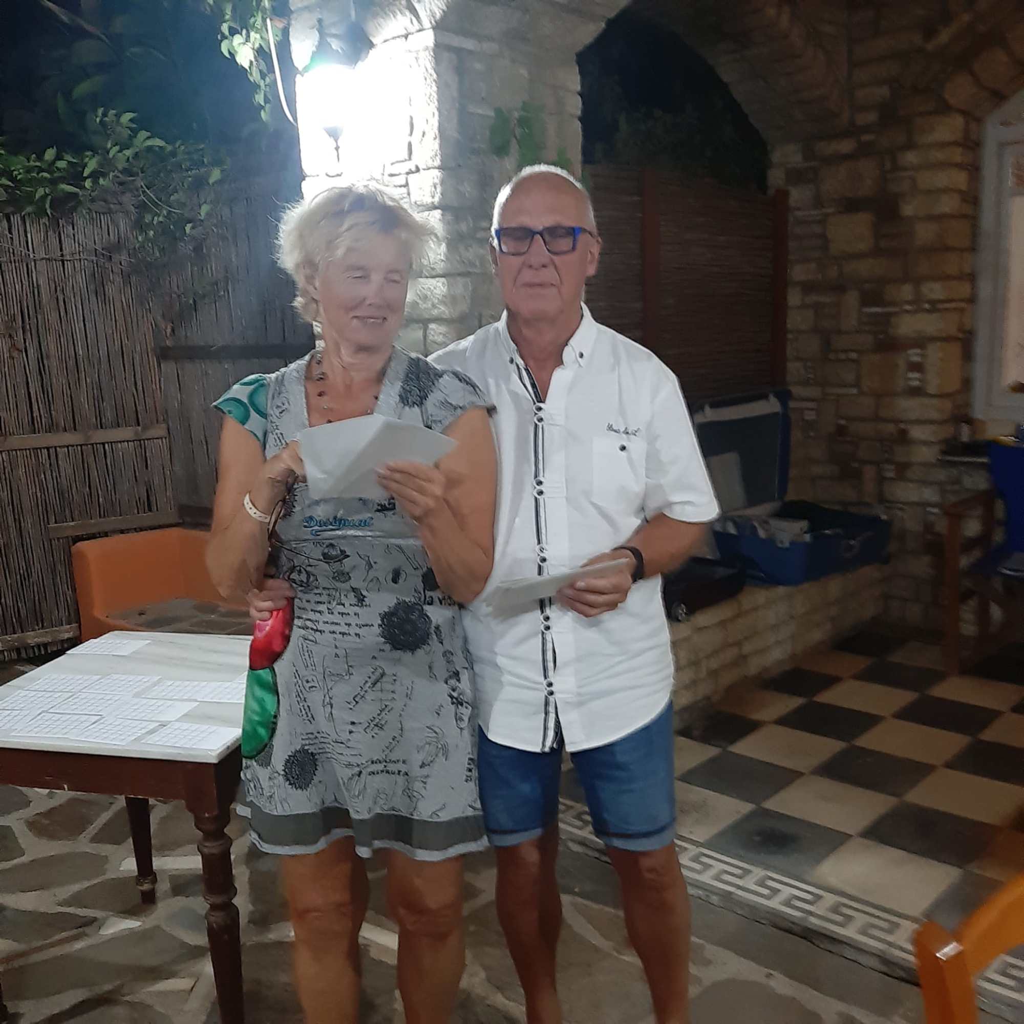 Toen werd de totale stand door Jan uitgedraaid en is de stand voor iedereen bekend gemaakt. De derde plaats was voor Hiske en partner met 56,0. De tweede plaats was voor Carel en Marianne met 61,72 en de winnaars van deze bridgevakantie zijn Hanny en Roelof geworden met 62,31 procent. Alle winnaars hebben een leuke cadeaubon gekregen en natuurlijk hebben we nog geproost. Naar de uitslagen.