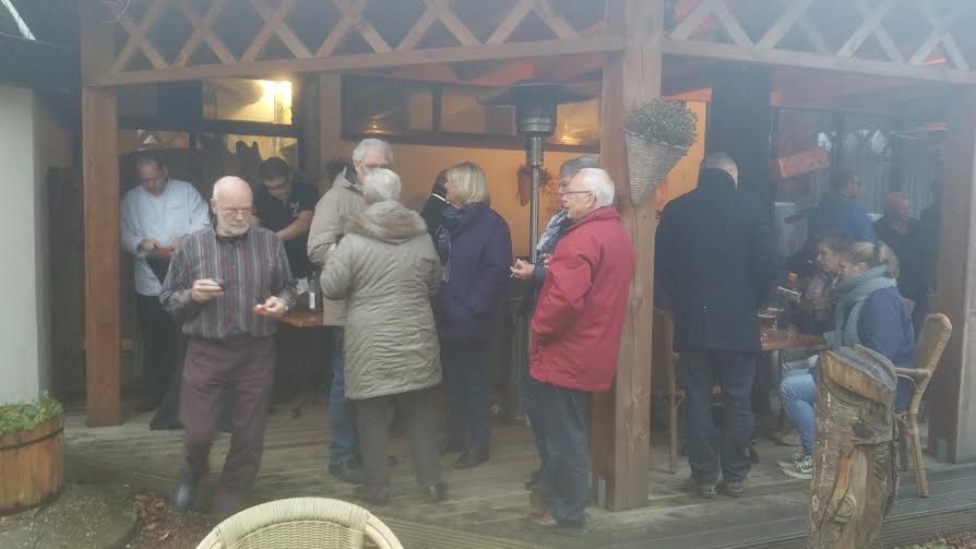 De rookoven staat al een tijdje aan wanneer we om 15.00 uur buiten op het terras een klein glaasje krijgen aangeboden met daarin een sterk alcoholische versnapering. Zeker om warm te worden want de temperatuur is nogal aan de frisse kant. Marco, de hoteleigenaar, snijdt de gerookte zalm flinterdun en drapeert chefwaardig dit heerlijke visje op een stokbroodje met een drupje Hollandaise saus. Over de hoeveelheid hebben we niets te klagen na één zalmpje te hebben opgesneden volgen er nog drie. In echte winterse sfeer smullen we van dit lekkers.