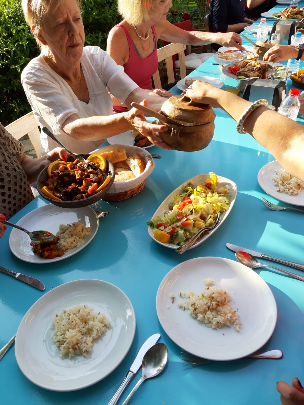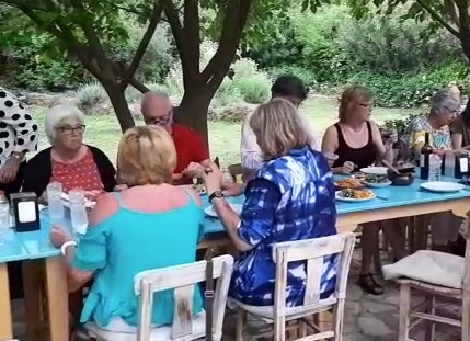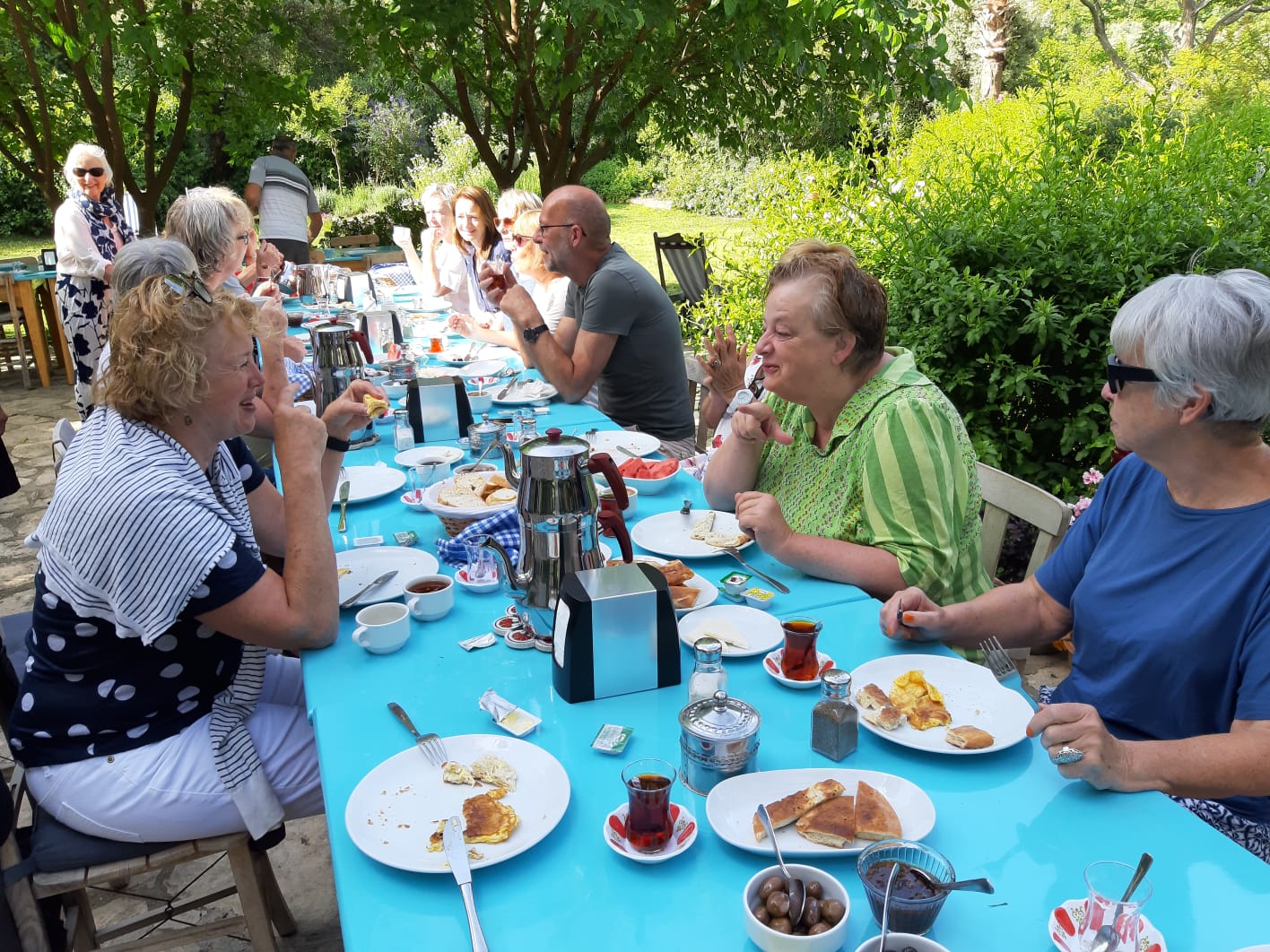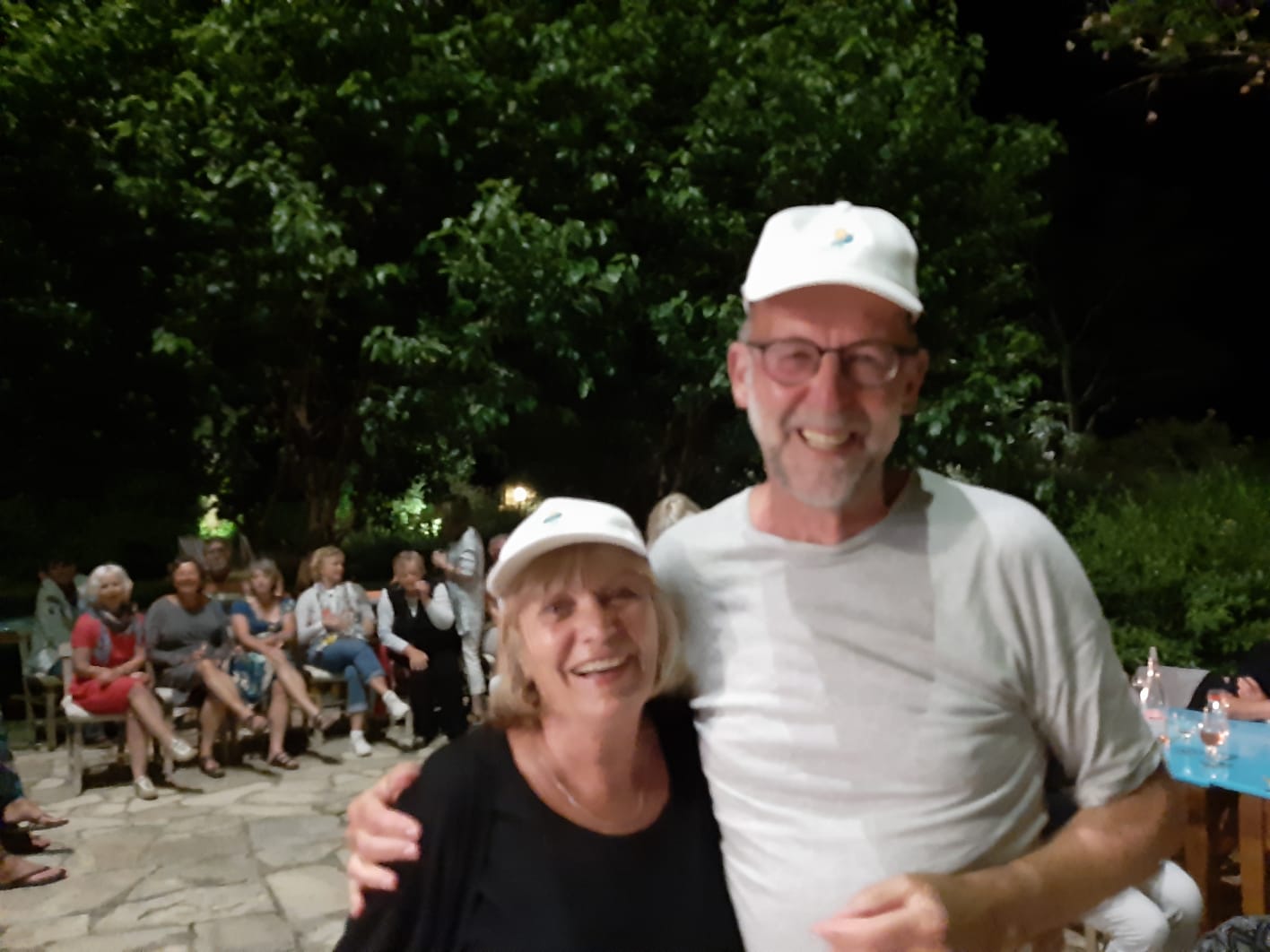 Aan lange tafels wordt buiten in de tuin het diner geserveerd. We laten ons verwennen door heerlijke gerechten om maar niet te spreken over de soezen met ijs als dessert. De sfeer zit er goed in, niet verwonderlijk in deze romantische omgeving en prachtig weer.