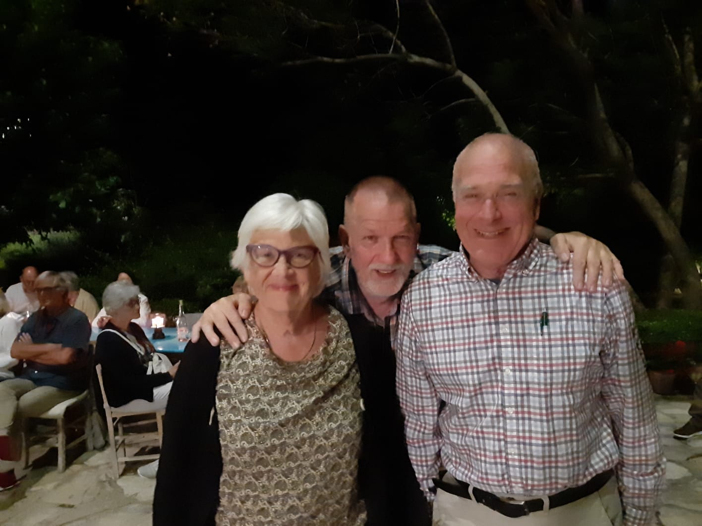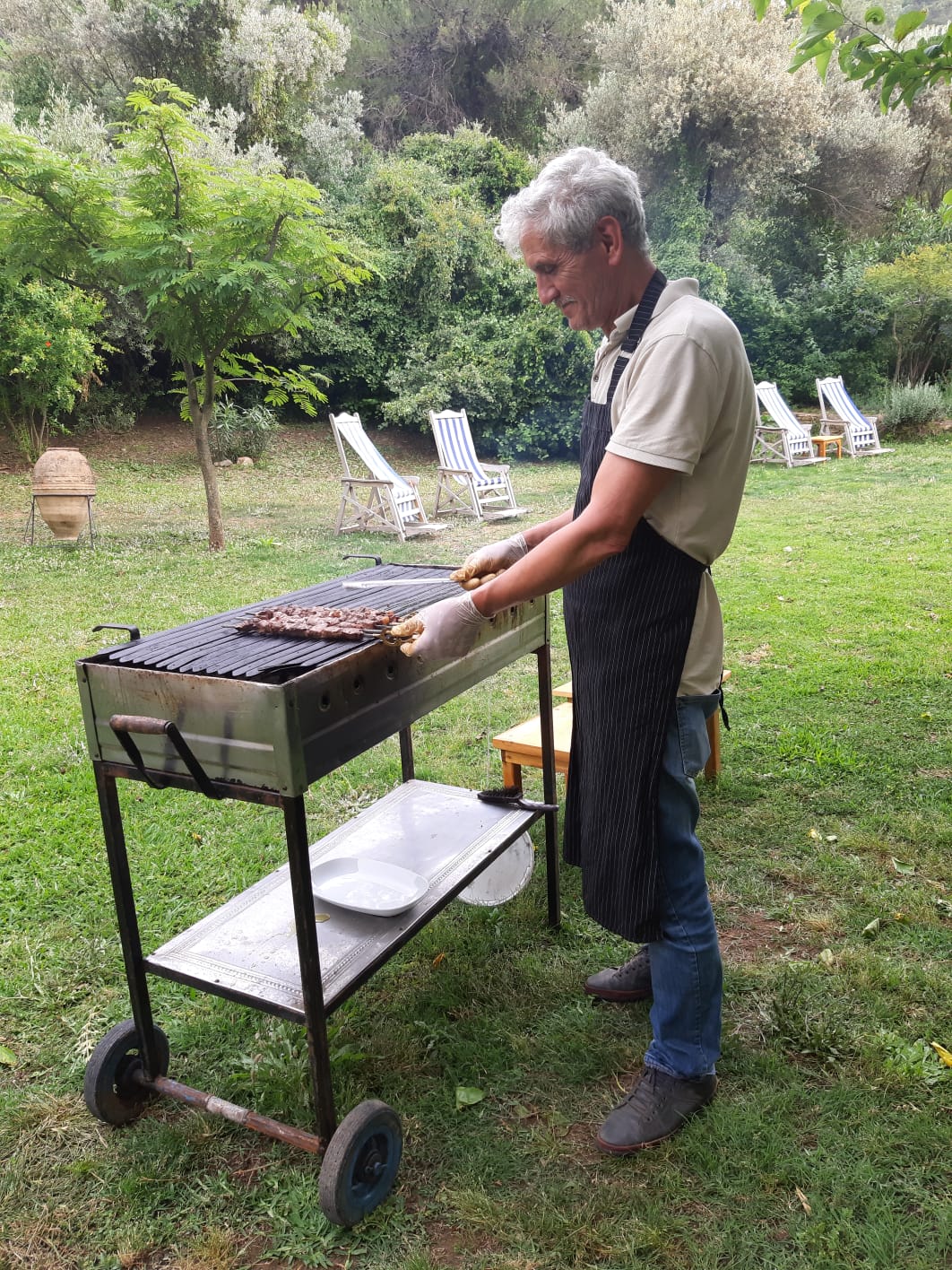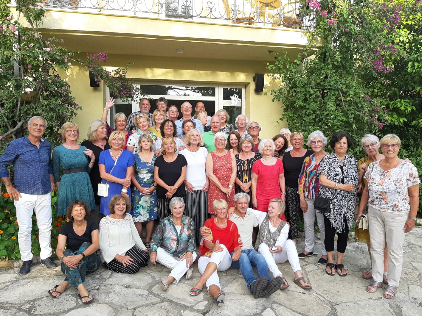 Aan lange tafels wordt buiten in de tuin het diner geserveerd. We laten ons verwennen door heerlijke gerechten om maar niet te spreken over de soezen met ijs als dessert. De sfeer zit er goed in, niet verwonderlijk in deze romantische omgeving en prachtig weer.