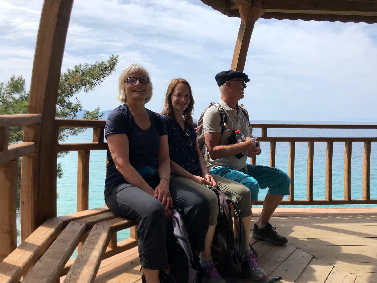 Vandaag zijn de plannen om te wandelen in het natuurgebied, te fietsen en we gaan varen. Het is voor iedereen weer een geweldige dag. De wandelaars komen na een tocht van 22 kilometer goedlachs terug. De fietsers hebben de omgeving verkend en tussendoor een klim gemaakt met prachtig uitzicht. Op de boot genoot men van de serene rust, de lunch, de gemoedelijke sfeer en de wonderlijke wereld vanaf boord gezien. Op het strand wordt een wild zwijntje gespot en Ids en Carolien waagden de sprong in het diepe, echte waaghalzen 🙂 . De lunch voor weer andere gasten aan het strand, dit keer met vis, gaf ook weer zo’n fijn vakantiegevoel.