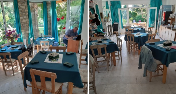 Na een heerlijke middag gaan we ons in alle rust voorbereiden op de 1e competitieronde van de 8 die komen gaan. Wat een mooie bridgezaal. Evelyn van Emel heeft gezorgd voor de juiste tafels maar ook dat alle tafels voorzien zijn van groene tafelkleden en kussentjes op de stoelen. Een dikke pluim!