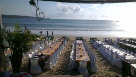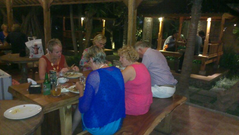 Hierna gaan we naar Jimbaran. In een eetgelegenheid langs het strand volgt ‘s middags eerst de derde bridgedrive. Laten we de uitslag van ons maar niet vermelden. Dramatisch. Na het bridgen, na ook hier weer tussen het bridgen door naar de zonsondergang gekeken te hebben, hebben we op het strand ook hier weer een gezamenlijk diner. Het eten bestond hier uit seafood, maar ikzelf eet geen vis en ook Helga koos ervoor om vegetarisch te eten. Als wij de verhalen van sommigen mochten geloven, hadden wij het beter getroffen. Andere daarentegen vonden dat ze lekker gegeten hebben. Hierna weer terug naar het hotel. Groet, Helga en Mark