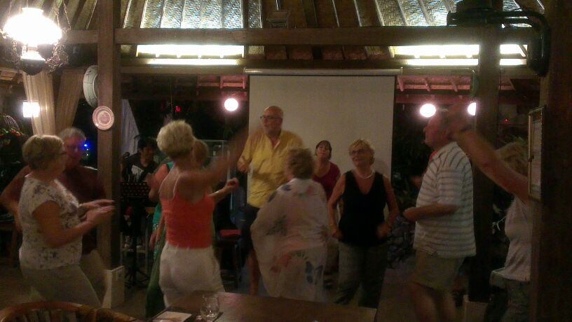 Een vrije dag met als afsluiting een culturele avond. Eten in een restaurantje waar we al eerder gebridged en gegeten hebben aan de overkant van het hotel. Een buffet staat klaar. Tussen de tafels waar wij zitten (twee lange tafels aan elkaar geschoven tafeltjes) staan andere tafels. Danseressen vragen om mee te dansen. Dat wekt de interesse van de groep. De groep is leuk, het bridgen is gezellig, het hotel is prima! Groet, Mark en Helga