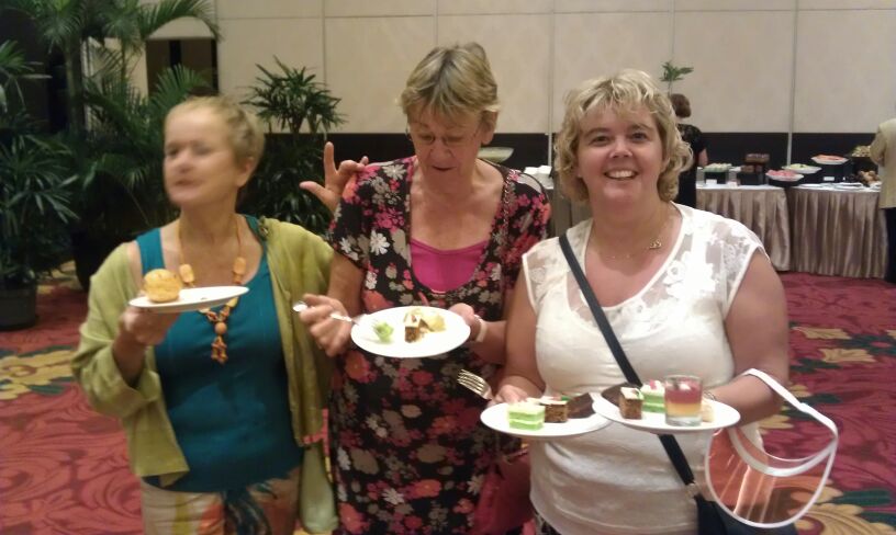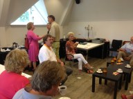 We spelen vijf ronden van drie spellen. Hierna houden we 10 minuten pauze en vervoegen ons rond de tafel. Het kringgesprek c.q. vragenuurtje open ik met een welkomstwoord, nog wat mededelingen en verder deel ik de (gebundelde) informatie uit van berichten die ik de afgelopen weken heb verstuurd via de e-mail. Na dit alles vraag ik of er vragen en opmerkingen zijn. Uiteenlopende zaken komen aan de orde. Een briljante tip is om elke dag een glas cola te drinken. Hiermee verlaag je de kans op darmproblemen. Iemand vraagt of dat samen mag met een borrel? Nuttige vragen worden gesteld en beantwoord. De tafels voor de high-tea beneden in het restaurant staan klaar. De groep schuift aan. Er wordt gegeten, gepraat en gelachen. De sfeer zit er goed in! Een grappige snuiter zegt: “Morgen annuleringen na deze kennismaking?”. Echhh nie.., hoor ik uit diverse hoeken.